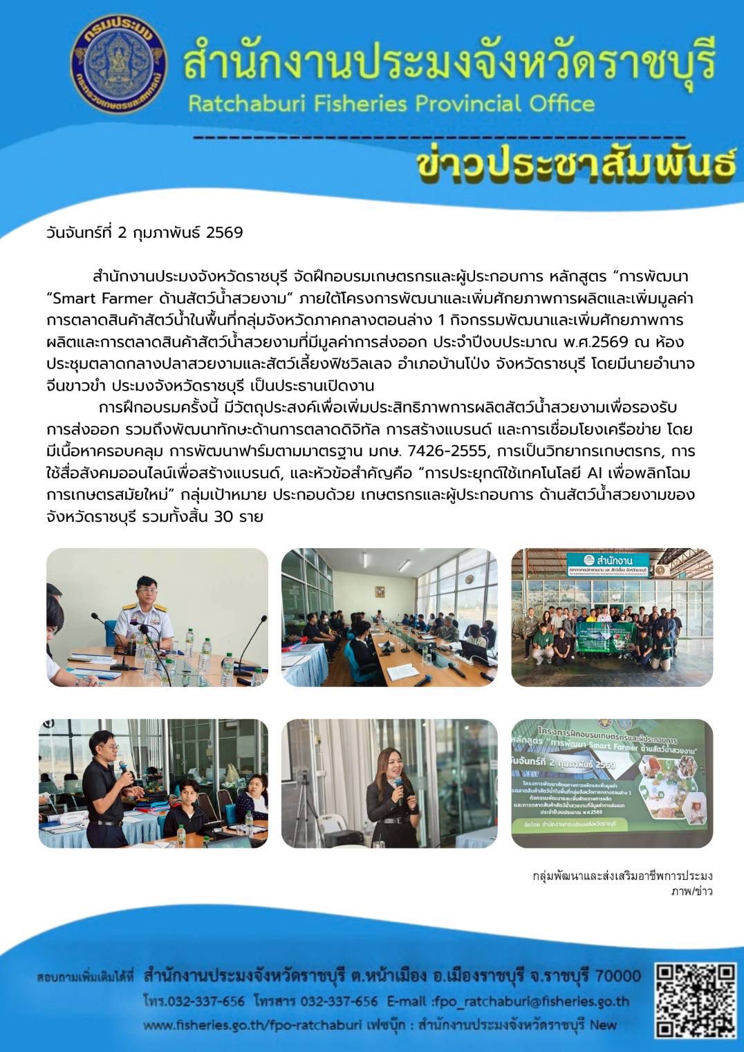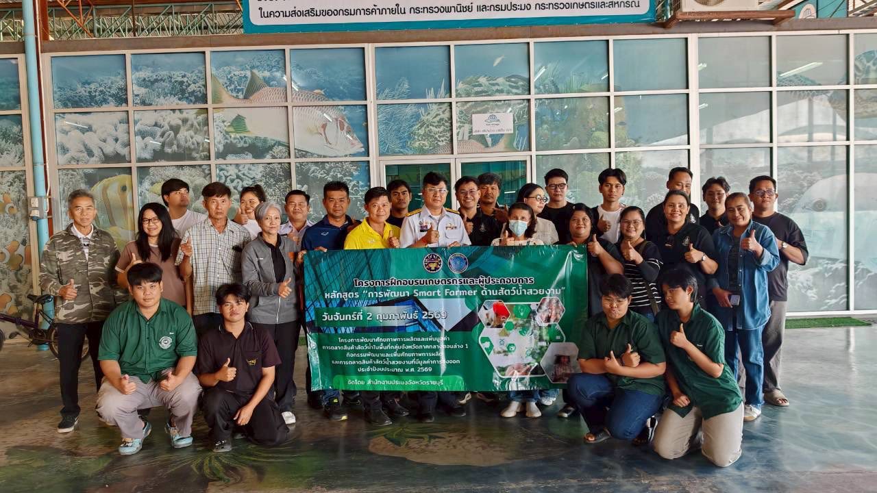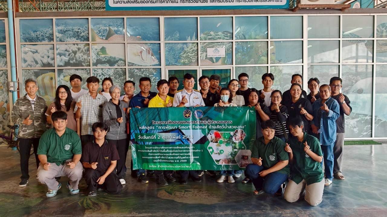 วันจันทร์ที่ 2 กุมภาพันธ์ 2569 สำนักงานประมงจังหวัดราชบุรี จัดฝึกอบรมเกษตรกรและผู้ประกอบการ หลักสูตร “การพัฒนา “Smart Farmer ด้านสัตว์น้ำสวยงาม” ภายใต้โครงการพัฒนาและเพิ่มศักยภาพการผลิตและเพิ่มมูลค่าการตลาดสินค้าสัตว์น้ำในพื้นที่กลุ่มจังหวัดภาคกลางตอนล่าง 1 กิจกรรมพัฒนาและเพิ่มศักยภาพการผลิตและการตลาดสินค้าสัตว์น้ำสวยงามที่มีมูลค่าการส่งออก ประจำปีงบประมาณ พ.ศ.2569 ณ ห้องประชุมตลาดกลางปลาสวยงามและสัตว์เลี้ยงฟิชวิลเลจ อำเภอบ้านโป่ง จังหวัดราชบุรี โดยมีนายอำนาจ จีนขาวขำ ประมงจังหวัดราชบุรี เป็นประธานเปิดงาน การฝึกอบรมครั้งนี้ มีวัตถุประสงค์เพื่อเพิ่มประสิทธิภาพการผลิตสัตว์น้ำสวยงามเพื่อรองรับการส่งออก รวมถึงพัฒนาทักษะด้านการตลาดดิจิทัล การสร้างแบรนด์ และการเชื่อมโยงเครือข่าย โดยมีเนื้อหาครอบคลุม การพัฒนาฟาร์มตามมาตรฐาน มกษ. 7426-2555, การเป็นวิทยากรเกษตรกร, การใช้สื่อสังคมออนไลน์เพื่อสร้างแบรนด์, และหัวข้อสำคัญคือ “การประยุกต์ใช้เทคโนโลยี AI เพื่อพลิกโฉมการเกษตรสมัยใหม่” กลุ่มเป้าหมาย ประกอบด้วย เกษตรกรและผู้ประกอบการ ด้านสัตว์น้ำสวยงามของจังหวัดราชบุรี รวมทั้งสิ้น 30 ราย