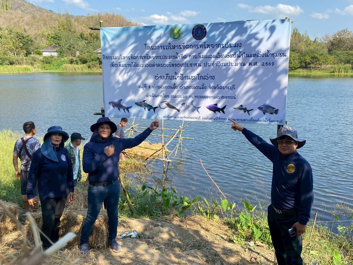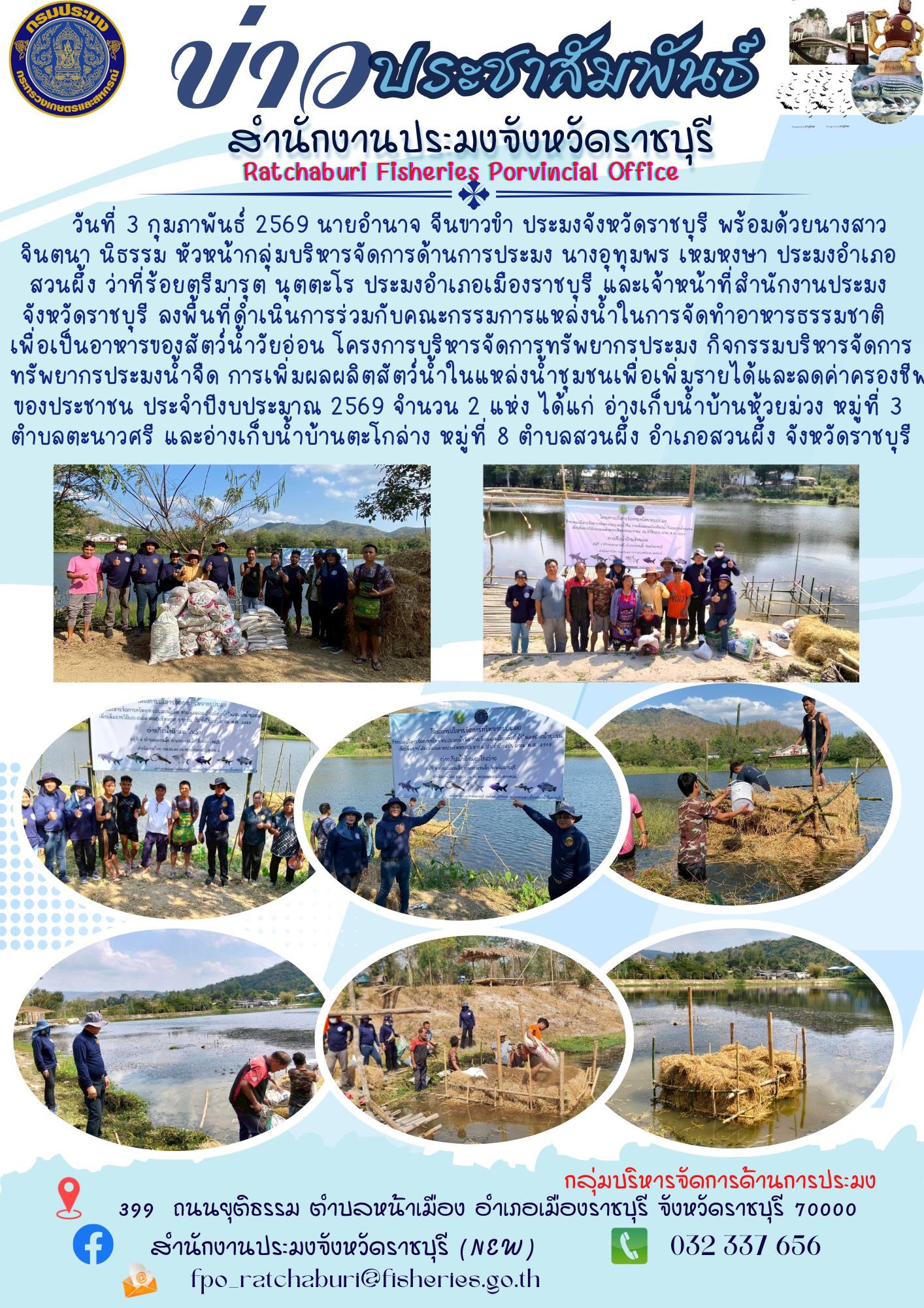 วันที่ 3 กุมภาพันธ์ 2569 นายอำนาจ จีนขาวขำ ประมงจังหวัดราชบุรี พร้อมด้วยนางสาวจินตนา นิธรรม หัวหน้ากลุ่มบริหารจัดการด้านการประมง นางอุทุมพร เหมหงษา ประมงอำเภอสวนผึ้ง ว่าที่ร้อยตรีมารุต นุตตะโร ประมงอำเภอเมืองราชบุรี และเจ้าหน้าที่สำนักงานประมงจังหวัดราชบุรี ลงพื้นที่ดำเนินการร่วมกับคณะกรรมการแหล่งน้ำในการจัดทำอาหารธรรมชาติ เพื่อเป็นอาหารของสัตว์น้ำวัยอ่อน โครงการบริหารจัดการทรัพยากรประมง กิจกรรมบริหารจัดการทรัพยากรประมงน้ำจืด การเพิ่มผลผลิตสัตว์น้ำในแหล่งน้ำชุมชนเพื่อเพิ่มรายได้และลดค่าครองชีพของประชาชน ประจำปีงบประมาณ 2569 จำนวน 2 แห่ง ได้แก่ อ่างเก็บน้ำบ้านห้วยม่วง หมู่ที่ 3 ตำบลตะนาวศรี และอ่างเก็บน้ำบ้านตะโกล่าง หมู่ที่ 8 ตำบลสวนผึ้ง อำเภอสวนผึ้ง จังหวัดราชบุรี