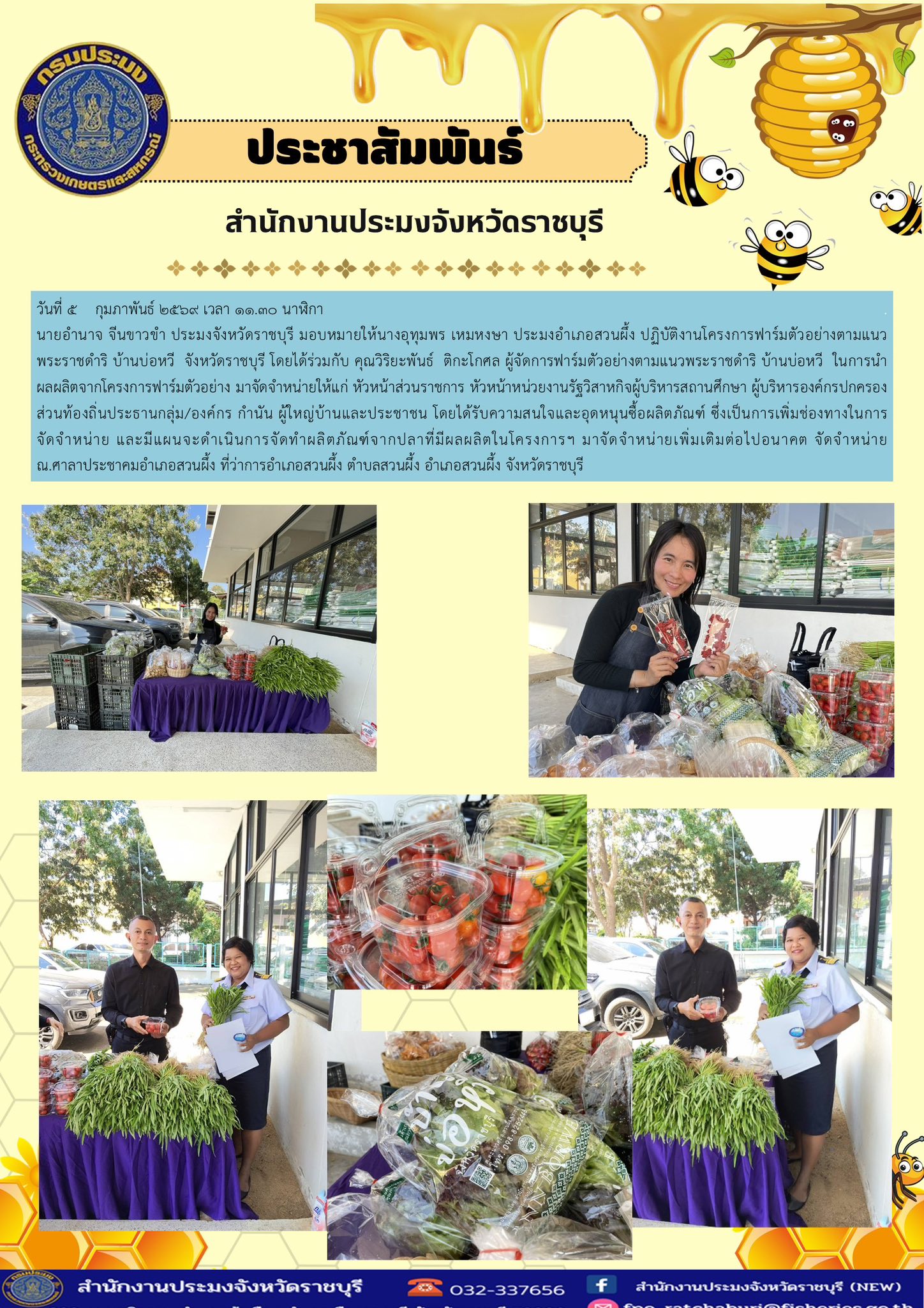 วันที่ 5 กุมภาพันธ์ 2569 เวลา 11.30 น. นายอำนาจ จีนขาวขำ ประมงจังหวัดราชบุรี มอบหมายให้นางอุทุมพร เหมหงษา ประมงอำเภอสวนผึ้ง ปฏิบัติงานโครงการฟาร์มตัวอย่างตามแนวพระราชดำริ บ้านบ่อหวี จังหวัดราชบุรี โดยได้ร่วมกับ คุณวิริยะพันธ์ ติกะโกศล ผู้จัดการฟาร์มตัวอย่างตามแนวพระราชดำริ บ้านบ่อหวี ในการนำผลผลิตจากโครงการฟาร์มตัวอย่าง มาจัดจำหน่ายให้แก่ หัวหน้าส่วนราชการ หัวหน้าหน่วยงานรัฐวิสาหกิจผู้บริหารสถานศึกษา ผู้บริหารองค์กรปกครองส่วนท้องถิ่นประธานกลุ่ม/องค์กร กำนัน ผู้ใหญ่บ้านและประชาชน โดยได้รับความสนใจและ ซื้อผลิตภัณฑ์ ซึ่งเป็นการเพิ่มช่องทางในการจัดจำหน่าย และมีแผนจะดำเนินการจัดทำผลิตภัณฑ์จากปลาที่มีผลผลิตในโครงการฯ มาจัดจำหน่ายเพิ่มเติมต่อไปในโอกาสหน้า จัดจำหน่าย ณ.ศาลาประชาคมอำเภอสวนผึ้ง ที่ว่าการอำเภอสวนผึ้ง ตำบลสวนผึ้ง อำเภอสวนผึ้ง จังหวัดราชบุรี