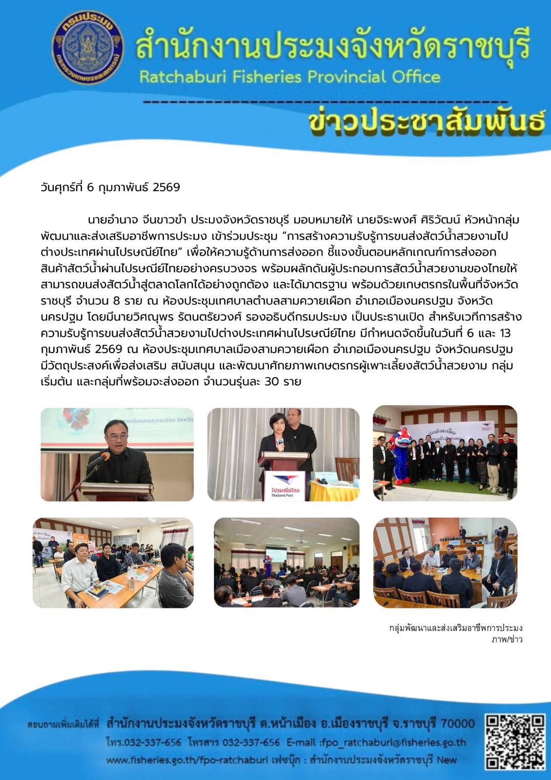วันศุกร์ที่ 6 กุมภาพันธ์ 2569 นายอำนาจ จีนขาวขำ ประมงจังหวัดราชบุรี มอบหมายให้ นายจิระพงศ์ ศิริวัฒน์ หัวหน้ากลุ่มพัฒนาและส่งเสริมอาชีพการประมง เข้าร่วมประชุม “การสร้างความรับรู้การขนส่งสัตว์น้ำสวยงามไปต่างประเทศผ่านไปรษณีย์ไทย” เพื่อให้ความรู้ด้านการส่งออก ชี้แจงขั้นตอนหลักเกณฑ์การส่งออกสินค้าสัตว์น้ำผ่านไปรษณีย์ไทยอย่างครบวงจร พร้อมผลักดันผู้ประกอบการสัตว์น้ำสวยงามของไทยให้สามารถขนส่งสัตว์น้ำสู่ตลาดโลกได้อย่างถูกต้อง และได้มาตรฐาน พร้อมด้วยเกษตรกรในพื้นที่จังหวัดราชบุรี จำนวน 8 ราย ณ ห้องประชุมเทศบาลตำบลสามควายเผือก อำเภอเมืองนครปฐม จังหวัดนครปฐม โดยมีนายวิศณุพร รัตนตรัยวงศ์ รองอธิบดีกรมประมง เป็นประธานเปิด