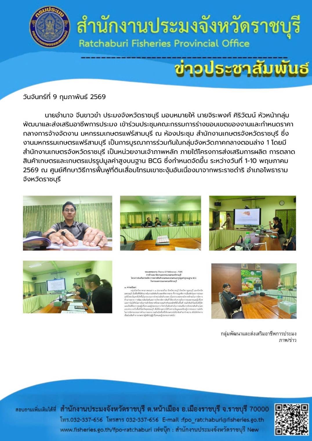 วันจันทร์ที่ 9 กุมภาพันธ์ 2569 นายอำนาจ จีนขาวขำ ประมงจังหวัดราชบุรี มอบหมายให้ นายจิระพงศ์ ศิริวัฒน์ หัวหน้ากลุ่มพัฒนาและส่งเสริมอาชีพการประมง เข้าร่วมประชุมคณะกรรมการร่างขอบเขตของงานและกำหนดราคากลางการจ้างจัดงาน มหกรรมเกษตรแฟร์สามบุรี ณ ห้องประชุม สำนักงานเกษตรจังหวัดราชบุรี ซึ่งงานมหกรรมเกษตรแฟร์สามบุรี เป็นการบูรณาการร่วมกันในกลุ่มจังหวัดภาคกลางตอนล่าง 1 โดยมีสำนักงานเกษตรจังหวัดราชบุรี เป็นหน่วยงานเจ้าภาพหลัก ภายใต้โครงการส่งเสริมการผลิต การตลาดสินค้าเกษตรและเกษตรแปรรูปมูลค่าสูงบนฐาน BCG ซึ่งกำหนดจัดขึ้น ระหว่างวันที่ 1-10 พฤษภาคม 2569 ณ ศูนย์ศึกษาวิธีการฟื้นฟูที่ดินเสื่อมโทรมเขาชะงุ้มอันเนื่องมาจากพระราชดำริ อำเภอโพธาราม จังหวัดราชบุรี