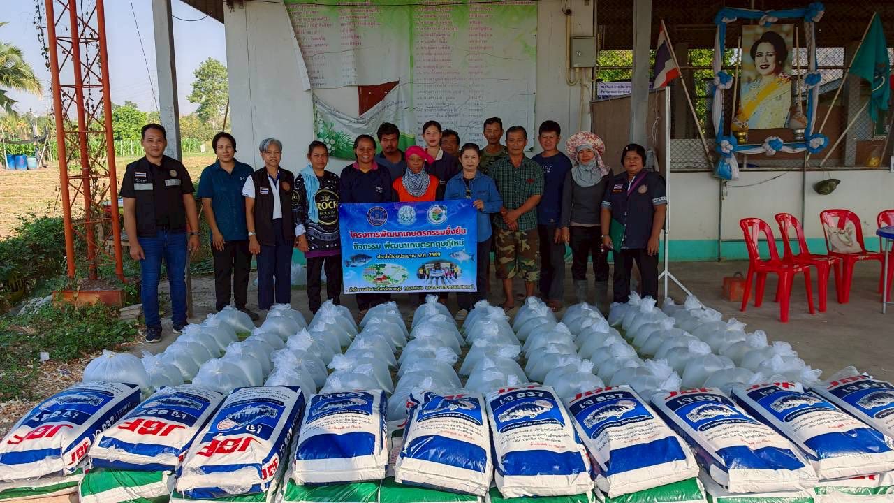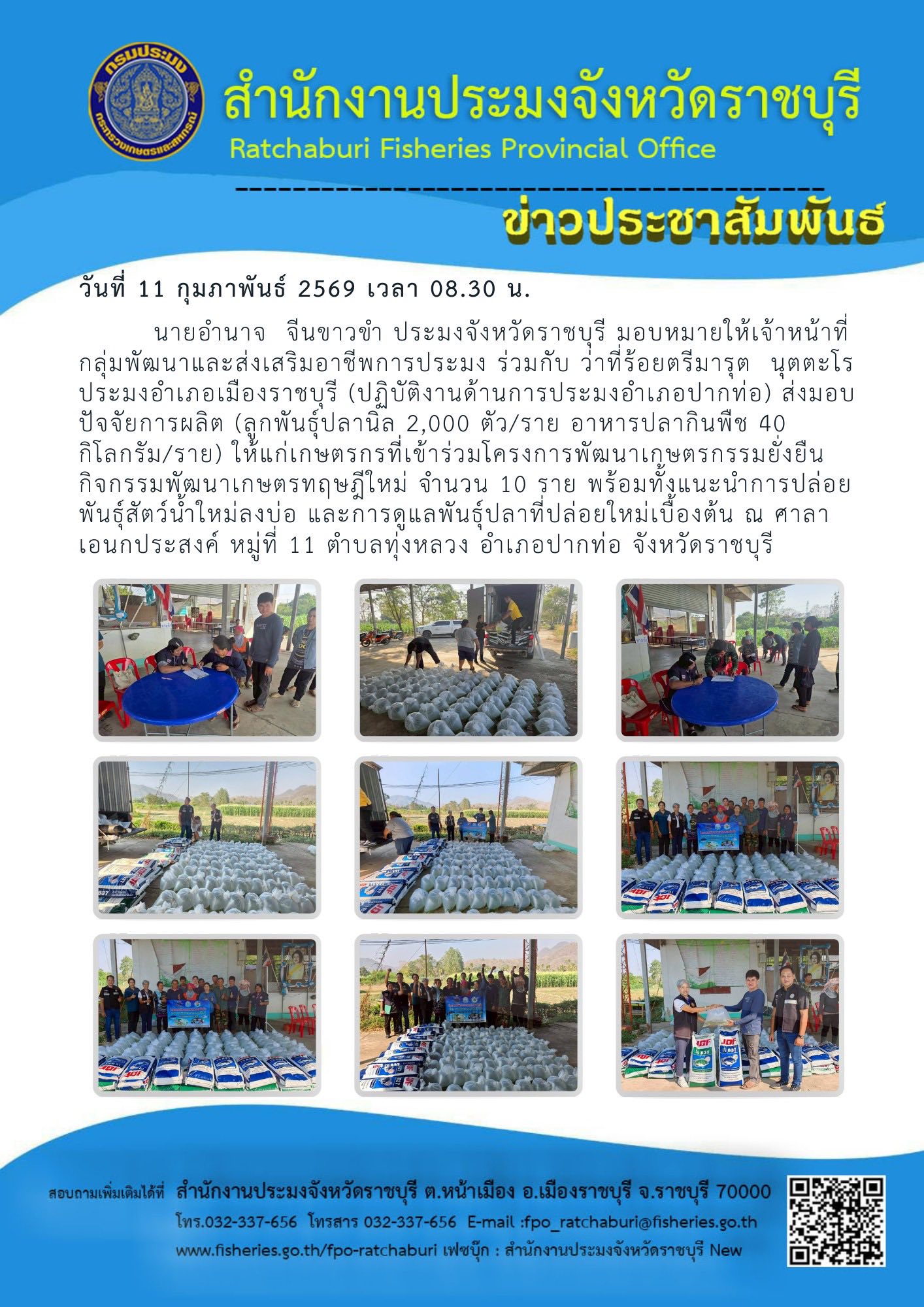 วันที่ 11 กุมภาพันธ์ 2569 เวลา 08.30 น. นายอำนาจ จีนขาวขำ ประมงจังหวัดราชบุรี มอบหมายให้เจ้าหน้าที่กลุ่มพัฒนาและส่งเสริมอาชีพการประมง ร่วมกับ ว่าที่ร้อยตรีมารุต นุตตะโร ประมงอำเภอเมืองราชบุรี (ปฏิบัติงานด้านการประมงอำเภอปากท่อ) ส่งมอบปัจจัยการผลิต (ลูกพันธุ์ปลานิล 2,000 ตัว/ราย อาหารปลากินพืช 40 กิโลกรัม/ราย) ให้แก่เกษตรกรที่เข้าร่วมโครงการพัฒนาเกษตรกรรมยั่งยืน กิจกรรมพัฒนาเกษตรทฤษฎีใหม่ จำนวน 10 ราย พร้อมทั้งแนะนำการปล่อยพันธุ์สัตว์น้ำใหม่ลงบ่อ และการดูแลพันธุ์ปลาที่ปล่อยใหม่เบื้องต้น ณ ศาลาเอนกประสงค์ หมู่ที่ 11 ตำบลทุ่งหลวง อำเภอปากท่อ จังหวัดราชบุรี
