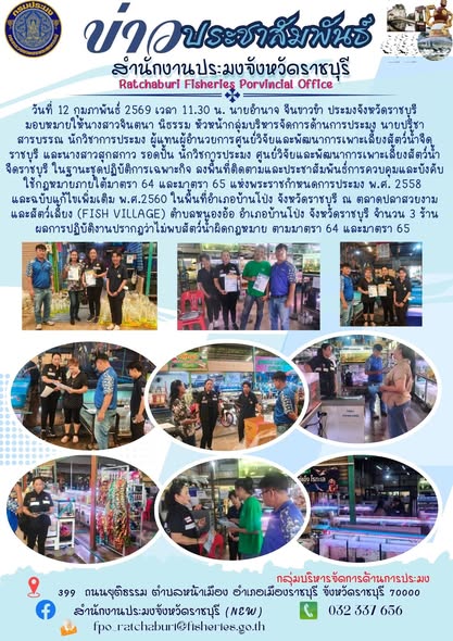 วันที่ 12 กุมภาพันธ์ 2569 เวลา 11.30 น. นายอำนาจ จีนขาวขำ ประมงจังหวัดราชบุรี มอบหมายให้นางสาวจินตนา นิธรรม หัวหน้ากลุ่มบริหารจัดการด้านการประมง นายปรีชา สารบรรณ นักวิชาการประมง ผู้แทนผู้อำนวยการศูนย์วิจัยและพัฒนาการเพาะเลี้ยงสัตว์น้ำจืดราชบุรี และนางสาวสุกสกาว รอดปั้น นักวิชการประมง ศูนย์วิจัยและพัฒนาการเพาะเลี้ยงสัตว์น้ำจืดราชบุรี ในฐานะชุดปฏิบัติการเฉพาะกิจ ลงพื้นที่ติดตามและประชาสัมพันธ์การควบคุมและบังคับใช้กฎหมายภายใต้มาตรา 64 และมาตรา 65 แห่งพระราชกำหนดการประมง พ.ศ. 2558 และฉบับแก้ไขเพิ่มเติม พ.ศ.2560 ในพื้นที่อำเภอบ้านโป่ง จังหวัดราชบุรี ณ ตลาดปลาสวยงามและสัตว์เลี้ยง (Fish Village) ตำบลหนองอ้อ อำเภอบ้านโป่ง จังหวัดราชบุรี จำนวน 3 ร้าน ไม่พบสัตว์น้ำผิดกฎหมาย ตามมาตรา 64 และมาตรา 65