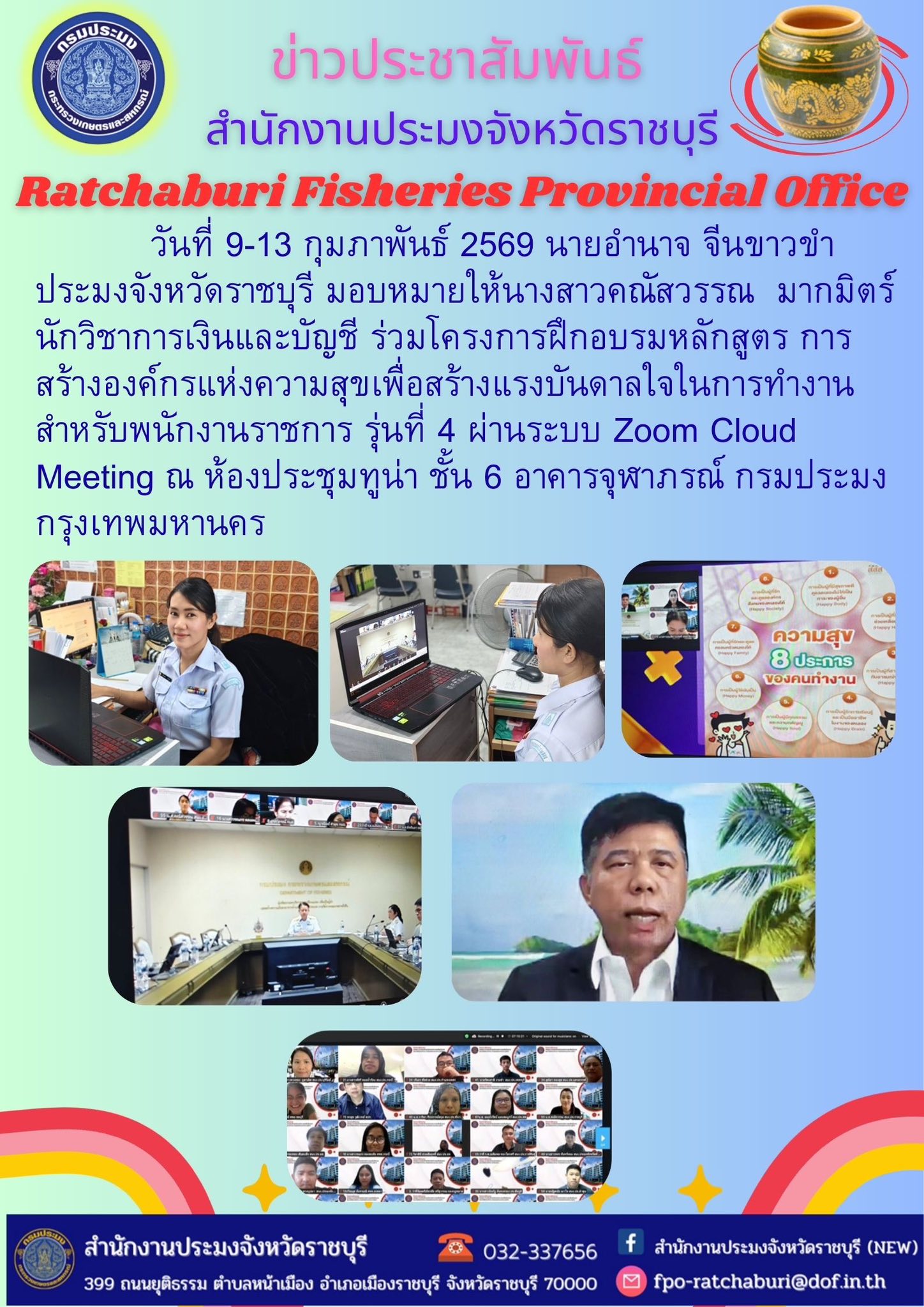 วันที่ 9-13 กุมภาพันธ์ 2569 นายอำนาจ จีนขาวขำ ประมงจังหวัดราชบุรี มอบหมายให้นางสาวคณัสวรรณ มากมิตร์ นักวิชาการเงินและบัญชี ร่วมโครงการฝึกอบรมหลักสูตร การสร้างองค์กรแห่งความสุขเพื่อสร้างแรงบันดาลใจในการทำงานสำหรับพนักงานราชการ รุ่นที่ 4 ผ่านระบบ Zoom Cloud Meeting ณ ห้องประชุมทูน่า ชั้น 6 อาคารจุฬาภรณ์ กรมประมง กรุงเทพมหานคร