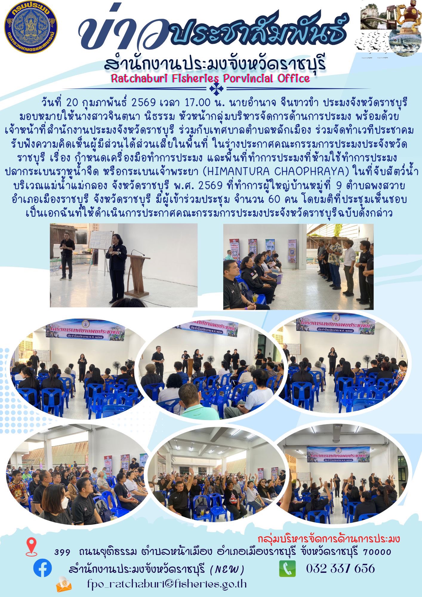 วันที่ 20 กุมภาพันธ์ 2569 เวลา 17.00 น. นายอำนาจ จีนขาวขำ ประมงจังหวัดราชบุรี มอบหมายให้นางสาวจินตนา นิธรรม หัวหน้ากลุ่มบริหารจัดการด้านการประมง พร้อมด้วยเจ้าหน้าที่สำนักงานประมงจังหวัดราชบุรี ร่วมกับเทศบาลตำบลหลักเมือง ร่วมจัดทำเวทีประชาคมรับฟังความคิดเห็นผู้มีส่วนได้ส่วนเสียในพื้นที่ ในร่างประกาศคณะกรรมการประมงประจังหวัดราชบุรี เรื่อง กำหนดเครื่องมือทำการประมง และพื้นที่ทำการประมงที่ห้ามใช้ทำการประมง ปลากระเบนราหูน้ำจืด หรือกระเบนเจ้าพระยา (Himantura chaophraya) ในที่จับสัตว์น้ำบริเวณแม่น้ำแม่กลอง จังหวัดราชบุรี พ.ศ. 2569 ที่ทำการผู้ใหญ่บ้านหมู่ที่ 9 ตำบลพงสวาย อำเภอเมืองราชบุรี จังหวัดราชบุรี มีผู้เข้าร่วมประชุม จำนวน 60 คน โดยมติที่ประชุมเห็นชอบเป็นเอกฉันท์ให้ดำเนินการประกาศคณะกรรมการประมงประจังหวัดราชบุรีฉบับดังกล่าว