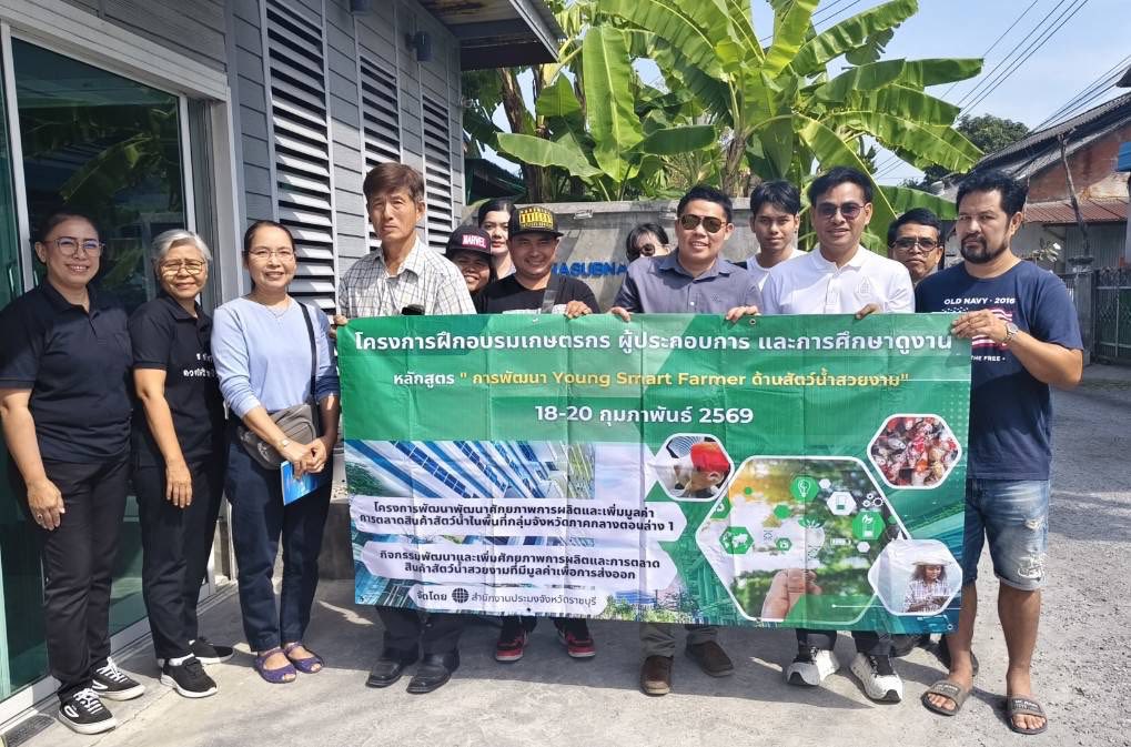 วันศุกร์ที่ 20 กุมภาพันธ์ 2569 นายอำนาจ จีนขาวขำ ประมงจังหวัดราชบุรี มอบหมายให้ นายจิระพงศ์ ศิริวัฒน์ หัวหน้ากลุ่มพัฒนาและส่งเสริมอาชีพการประมง พร้อมด้วยเจ้าหน้าที่ นำเกษตรกร และผู้ประกอบการด้านสัตว์น้ำสวยงามที่เข้าร่วมโครงการฝึกอบรม และศึกษาดูงาน หลักสูตร “การพัฒนา Young Smart Farmer ด้านสัตว์น้ำสวยงาม” ภายใต้โครงการพัฒนาและเพิ่มศักยภาพการผลิตและเพิ่มมูลค่าการตลาดสินค้าสัตว์น้ำในพื้นที่กลุ่มจังหวัดภาคกลางตอนล่าง 1 กิจกรรมพัฒนาและเพิ่มศักยภาพการผลิตและการตลาดสินค้าสัตว์น้ำสวยงามที่มีมูลค่าการส่งออก ประจำปีงบประมาณ พ.ศ.2569 ร่วมศึกษาดูงาน ณ บริษัท ซีจีเอส อินเตอร์ฟาร์ม (ประเทศไทย) จำกัด จังหวัดกรุงเทพมหานคร การสมทบฟาร์ม จังหวัดนครปฐม และศักดิ์ชัยฟาร์ม จังหวัดราชบุรี เพื่อแลกเปลี่ยนเรียนรู้ ด้านการผลิตสัตว์น้ำสวยงาม เพื่อรองรับการส่งออก เพิ่มโอกาสธุรกิจสัตว์น้ำสวยงามไทยให้ก้าวไกลสู่สากล มีกลุ่มเป้าหมายเข้าร่วมกิจกรรมพร้อมเจ้าหน้าที่ รวมจำนวน 18 ราย โดยการฝึกอบรมจัดขึ้น ระหว่างวันที่ 18-20 กุมภาพันธ์ 2569 รวมจำนวน 3 วัน