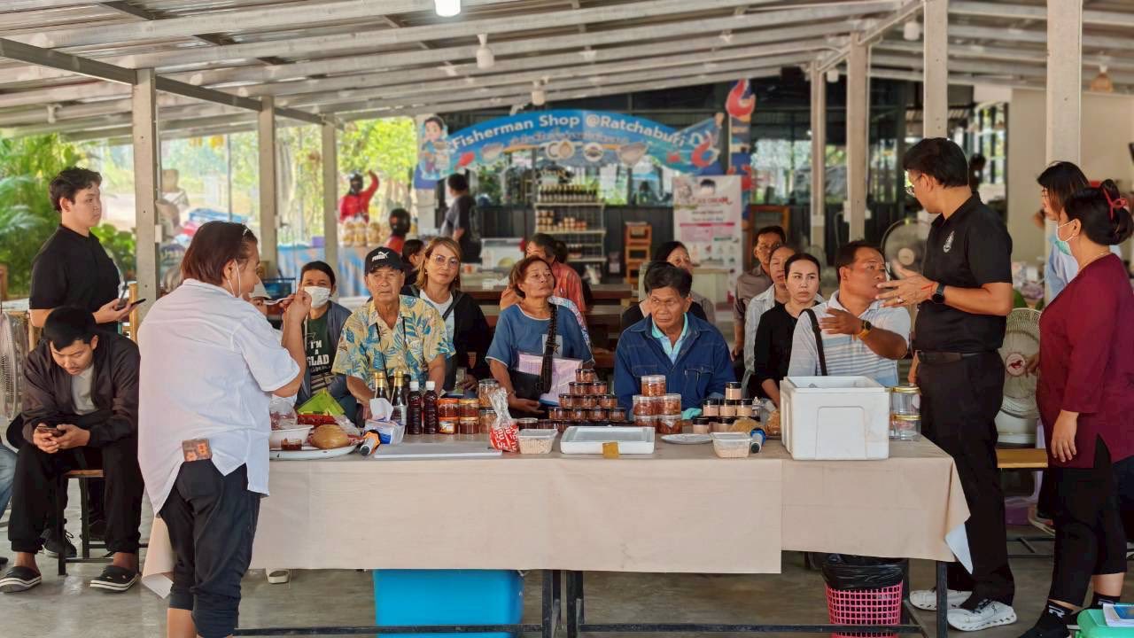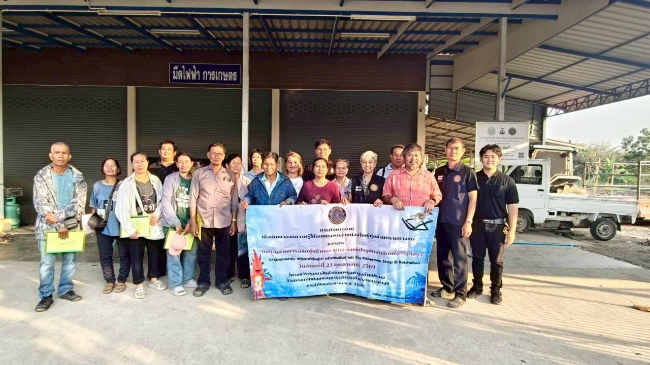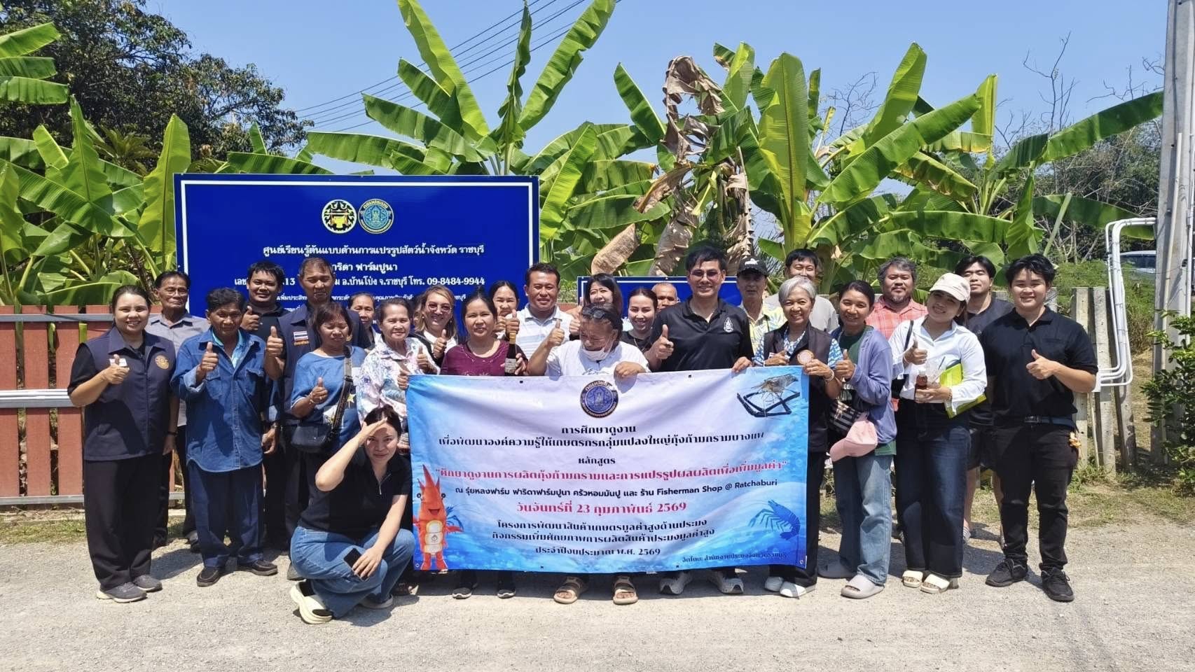 วันจันทร์ที่ 23 กุมภาพันธ์ 2569 นายอำนาจ จีนขาวขำ ประมงจังหวัดราชบุรี มอบหมายให้นายจิระพงศ์ ศิริวัฒน์ พร้อมด้วยเจ้าหน้าที่กลุ่มพัฒนาและส่งเสริมอาชีพการประมง จัดกิจกรรมฝึกอบรมและศึกษาดูงาน แก่สมาชิก กลุ่มแปลงใหญ่ผู้เลี้ยงกุ้งก้ามกรามบางแพ ตามโครงการพัฒนาสินค้าเกษตรมูลค่าสูงด้านประมงกิจกรรมเพิ่มศักยภาพการผลิตสินค้าประมงมูลค่าสูงประจำปีงบประมาณ พ.ศ. 2569 หลักสูตร “ศึกษาดูงานผลิตกุ้งก้ามกรามเเละแปรรูปผลผลิตเพื่อเพิ่มมูลค่า” ณ รุ่ยหลงฟาร์ม ศูนย์เรียนรู้ต้นแบบด้านการแปรรูปสัตว์น้ำ ฟาริดาฟาร์มปูนา ครัวหอมมันปู และ ร้าน Fisherman Shop @ Ratchaburi ตำบลคุ้งพยอม อำเภอบ้านโป่ง จังหวัดราชบุรี เพื่อพัฒนาองค์ความรู้เกี่ยวกับกระบวนการผลิต การบริหารจัดการ การแปรรูป และการตลาด อันเป็นการยกระดับคุณภาพสินค้า เพิ่มมูลค่า สร้างรายได้ และเสริมสร้างขีดความสามารถในการแข่งขันอย่างยั่งยืน โดยมีนายมณฑล อ่วมเทศ ประมงอำเภอบางแพ เเละ นางขวัญฤทัย แซ่ลี้ ประมงอำเภอบ้านโป่ง ร่วมกิจกรรมในครั้งนี้ด้วย