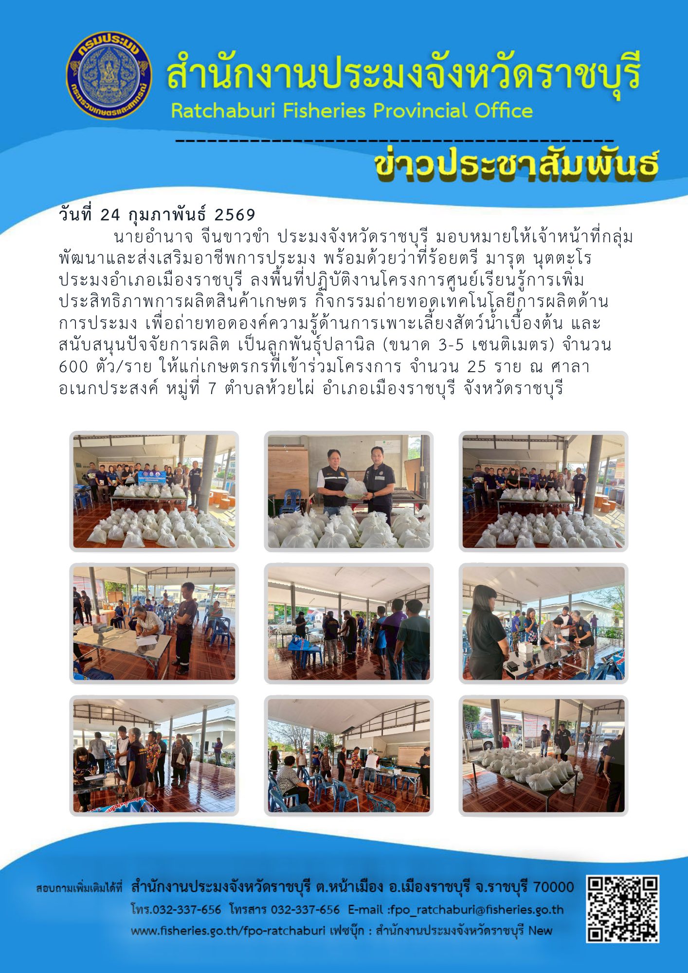 วันที่ 24 กุมภาพันธ์ 2569 นายอำนาจ จีนขาวขำ ประมงจังหวัดราชบุรี มอบหมายให้เจ้าหน้าที่กลุ่มพัฒนาและส่งเสริมอาชีพการประมง พร้อมด้วยว่าที่ร้อยตรี มารุต นุตตะโร ประมงอำเภอเมืองราชบุรี ลงพื้นที่ปฏิบัติงานโครงการศูนย์เรียนรู้การเพิ่มประสิทธิภาพการผลิตสินค้าเกษตร กิจกรรมถ่ายทอดเทคโนโลยีการผลิตด้านการประมง เพื่อถ่ายทอดองค์ความรู้ด้านการเพาะเลี้ยงสัตว์น้ำเบื้องต้น และสนับสนุนปัจจัยการผลิต เป็นลูกพันธุ์ปลานิล (ขนาด 3-5 เซนติเมตร) จำนวน 600 ตัว/ราย ให้แก่เกษตรกรที่เข้าร่วมโครงการ จำนวน 25 ราย ณ ศาลาอเนกประสงค์ หมู่ที่ 7 ตำบลห้วยไผ่ อำเภอเมืองราชบุรี จังหวัดราชบุรี