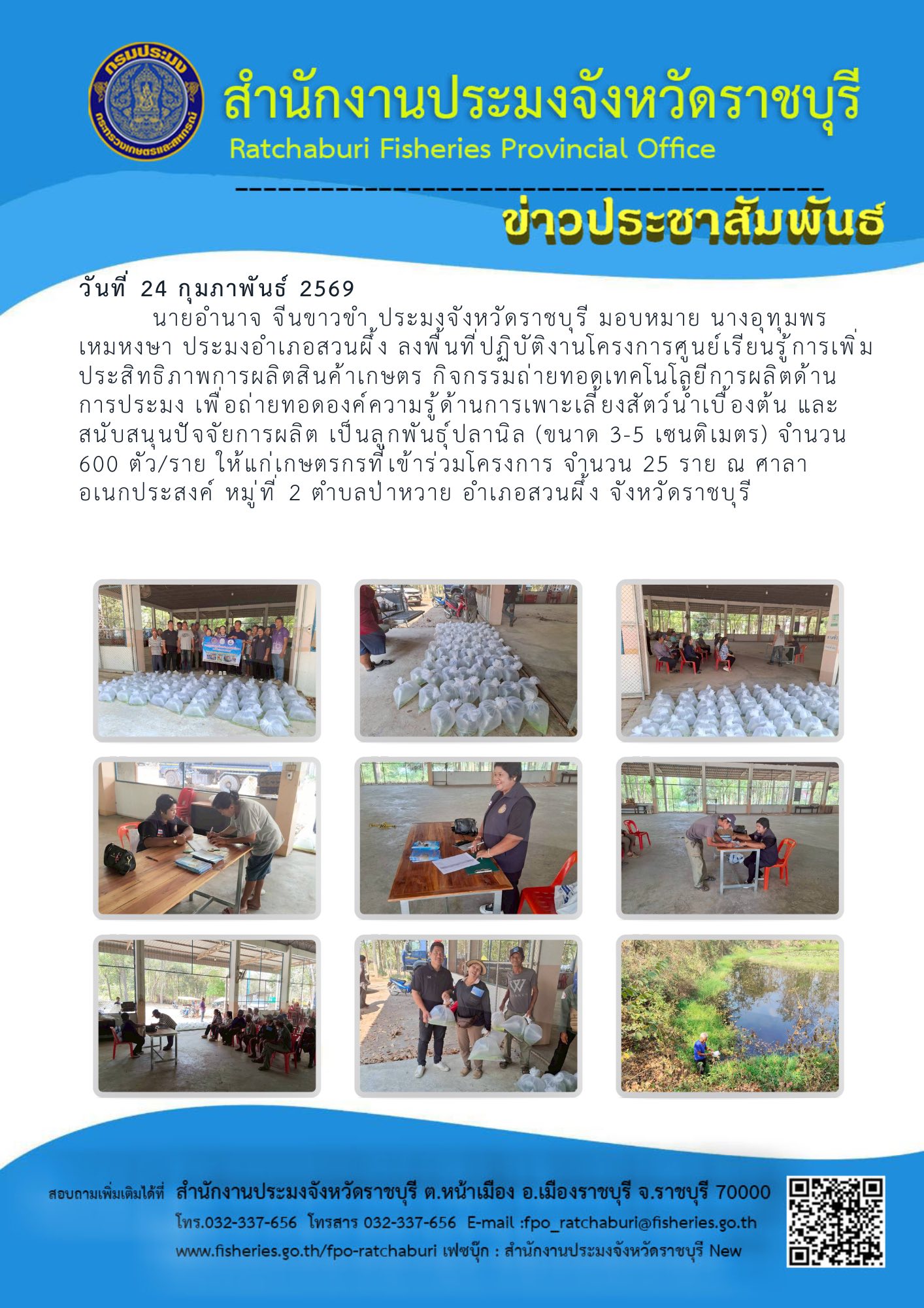 วันที่ 24 กุมภาพันธ์ 2569 นายอำนาจ จีนขาวขำ ประมงจังหวัดราชบุรี มอบหมาย นางอุทุมพร เหมหงษา ประมงอำเภอสวนผึ้ง ลงพื้นที่ปฏิบัติงานโครงการศูนย์เรียนรู้การเพิ่มประสิทธิภาพการผลิตสินค้าเกษตร กิจกรรมถ่ายทอดเทคโนโลยีการผลิตด้านการประมง เพื่อถ่ายทอดองค์ความรู้ด้านการเพาะเลี้ยงสัตว์น้ำเบื้องต้น และสนับสนุนปัจจัยการผลิต เป็นลูกพันธุ์ปลานิล (ขนาด 3-5 เซนติเมตร) จำนวน 600 ตัว/ราย ให้แก่เกษตรกรที่เข้าร่วมโครงการ จำนวน 25 ราย ณ ศาลาอเนกประสงค์ หมู่ที่ 2 ตำบลป่าหวาย อำเภอสวนผึ้ง จังหวัดราชบุรี
