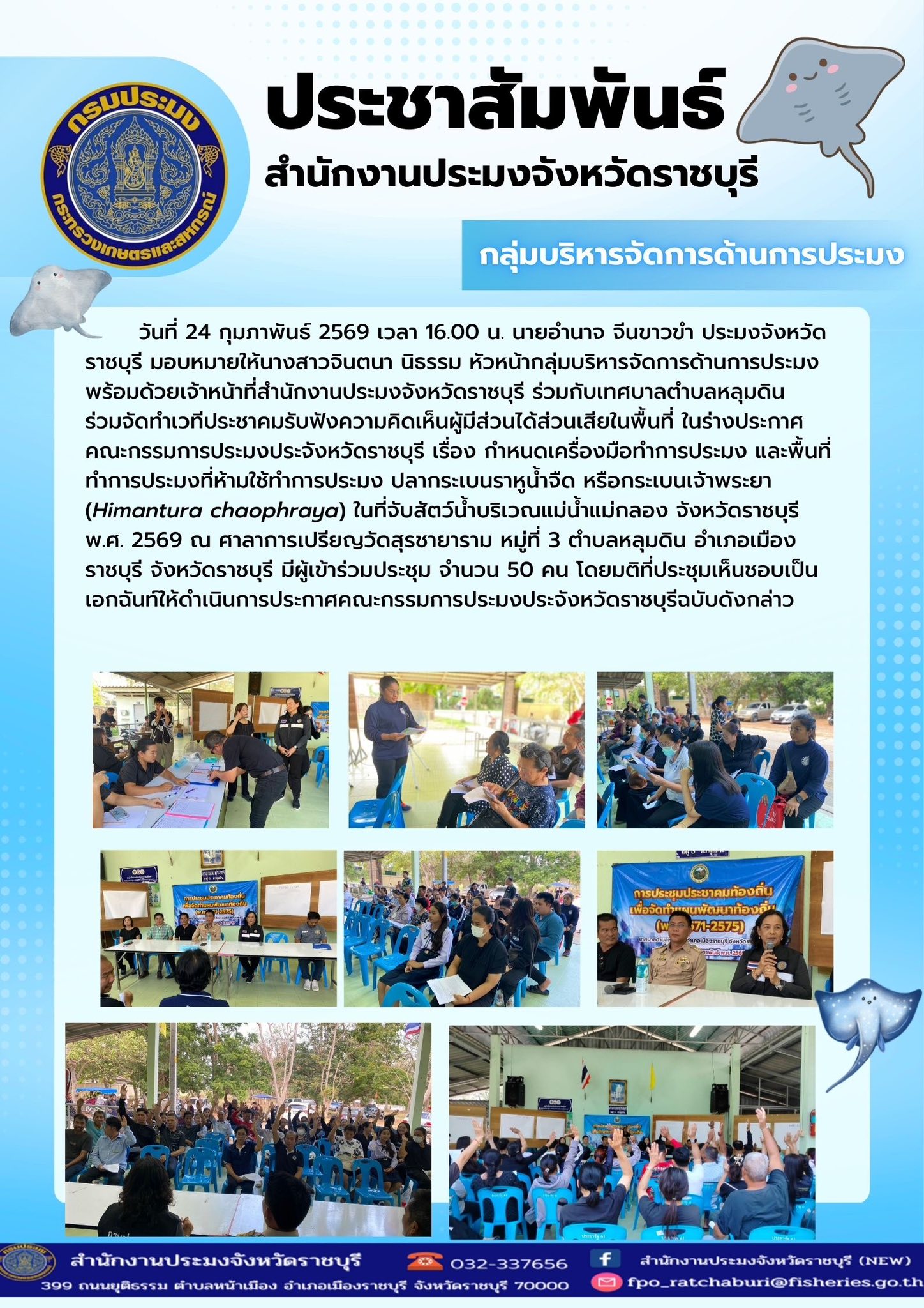วันที่ 24 กุมภาพันธ์ 2569 เวลา 15.00 น. นายอำนาจ จีนขาวขำ ประมงจังหวัดราชบุรี มอบหมายให้นางสาวจินตนา นิธรรม หัวหน้ากลุ่มบริหารจัดการด้านการประมง พร้อมด้วย นางขวัญฤทัย แซ่ลี้ และเจ้าหน้าที่สำนักงานประมงจังหวัดราชบุรี เพื่อลงพื้นที่ประชุมเตรียมความพร้อมการเปิดจับผลผลิตสัตว์น้ำ ในโครงการบริหารจัดการทรัพยากรประมง ในแหล่งน้ำชุมชนพื่อเพิ่มรายได้และลดค่าครองชีพของประชาชน (แหล่งน้ำปีงบประมาณ 2568) ณ บึงลาดใหญ่ หมู่ 2 ตำบลลาดบัวขาว อำเภอบ้านโป่ง จังหวัดราชบุรี และประชาสัมพันธ์ประกาศกรมประมง เรื่อง หลักเกณฑ์การขึ้นทะเบียนองค์กรชุมชนประมงท้องถิ่น พ.ศ. 2565 ชี้แจง ระเบียบ ข้อบังคับและขั้นตอน ในการจัดตั้งองค์กรชุมชนประมงท้องถิ่น ให้กับกลุ่มเกษตรกรในพื้นที่ ตำบลลาดบัวขาว อำเภอบ้านโป่ง จังหวัดราชบุรี
