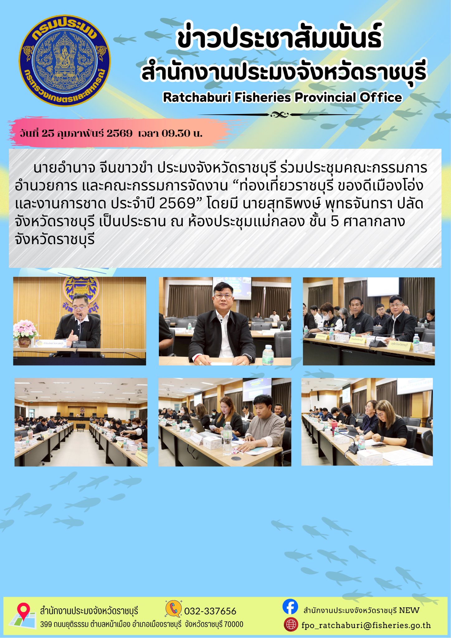 วันที่ 25 กุมภาพันธ์ 2569 เวลา 09.30 น. นายอำนาจ จีนขาวขำ ประมงจังหวัดราชบุรี ร่วมประชุมคณะกรรมการอำนวยการ และคณะกรรมการจัดงาน “ท่องเที่ยวราชบุรี ของดีเมืองโอ่ง และงานการชาด ประจำปี 2569” โดยมี นายสุทธิพงษ์ พุทธจันทรา ปลัดจังหวัดราชบุรี เป็นประธาน ณ ห้องประชุมแม่กลอง ชั้น 5 ศาลากลางจังหวัดราชบุรี