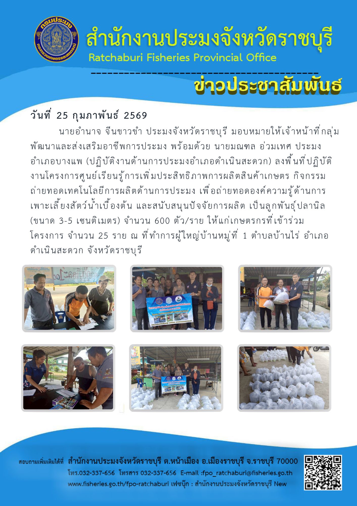 วันที่ 25 กุมภาพันธ์ 2569 นายอำนาจ จีนขาวขำ ประมงจังหวัดราชบุรี มอบหมายให้เจ้าหน้าที่กลุ่มพัฒนาและส่งเสริมอาชีพการประมง พร้อมด้วย นายมณฑล อ่วมเทศ ประมงอำเภอบางแพ (ปฏิบัติงานด้านการประมงอำเภอดำเนินสะดวก) ลงพื้นที่ปฏิบัติงานโครงการศูนย์เรียนรู้การเพิ่มประสิทธิภาพการผลิตสินค้าเกษตร กิจกรรมถ่ายทอดเทคโนโลยีการผลิตด้านการประมง เพื่อถ่ายทอดองค์ความรู้ด้านการเพาะเลี้ยงสัตว์น้ำเบื้องต้น และสนับสนุนปัจจัยการผลิต เป็นลูกพันธุ์ปลานิล (ขนาด 3-5 เซนติเมตร) จำนวน 600 ตัว/ราย ให้แก่เกษตรกรที่เข้าร่วมโครงการ จำนวน 25 ราย ณ ที่ทำการผู้ใหญ่บ้านหมู่ที่ 1 ตำบลบ้านไร่ อำเภอดำเนินสะดวก จังหวัดราชบุรี