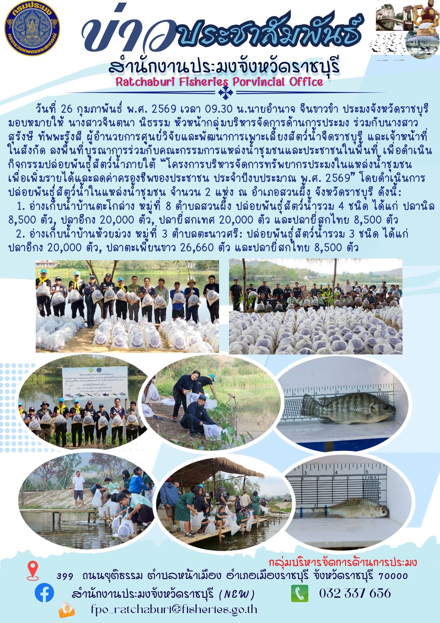 วันที่ 26 กุมภาพันธ์ พ.ศ. 2569 เวลา 09.30 น. นายอำนาจ จีนขาวขำ ประมงจังหวัดราชบุรี มอบหมายให้ นางสาวจินตนา นิธรรม หัวหน้ากลุ่มบริหารจัดการด้านการประมง ร่วมกับนางสาวสุรังษี ทัพพะรังสี ผู้อำนวยการศูนย์วิจัยและพัฒนาการเพาะเลี้ยงสัตว์น้ำจืดราชบุรี และเจ้าหน้าที่ในสังกัด ลงพื้นที่บูรณาการร่วมกับคณะกรรมการแหล่งน้ำชุมชนและประชาชนในพื้นที่ เพื่อดำเนินกิจกรรมปล่อยพันธุ์สัตว์น้ำภายใต้ “โครงการบริหารจัดการทรัพยากรประมงในแหล่งน้ำชุมชน เพื่อเพิ่มรายได้และลดค่าครองชีพของประชาชน ประจำปีงบประมาณ พ.ศ. 2569” โดยดำเนินการปล่อยพันธุ์สัตว์น้ำในแหล่งน้ำชุมชน จำนวน 2 แห่ง ณ อำเภอสวนผึ้ง จังหวัดราชบุรี ดังนี้: