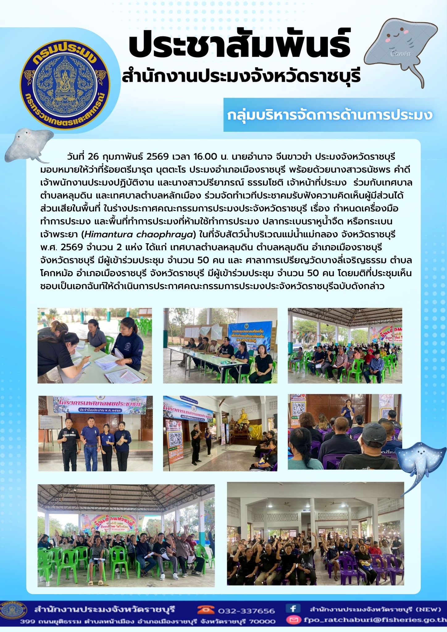 วันที่ 26 กุมภาพันธ์ 2569 เวลา 16.00 น. นายอำนาจ จีนขาวขำ ประมงจังหวัดราชบุรี มอบหมายให้ว่าที่ร้อยตรีมารุต นุตตะโร ประมงอำเภอเมืองราชบุรี พร้อยด้วยนางสาวธนัชพร คำดี เจ้าพนักงานประมงปฏิบัติงาน และนางสาวปรียาภรณ์ ธรรมโชติ เจ้าหน้าที่ประมง ร่วมกับเทศบาลตำบลหลุมดิน และเทศบาลตำบลหลักเมือง ร่วมจัดทำเวทีประชาคมรับฟังความคิดเห็นผู้มีส่วนได้ส่วนเสียในพื้นที่ ในร่างประกาศคณะกรรมการประมงประจังหวัดราชบุรี เรื่อง กำหนดเครื่องมือทำการประมง และพื้นที่ทำการประมงที่ห้ามใช้ทำการประมง ปลากระเบนราหูน้ำจืด หรือกระเบนเจ้าพระยา (Himantura chaophraya) ในที่จับสัตว์น้ำบริเวณแม่น้ำแม่กลอง จังหวัดราชบุรี พ.ศ. 2569 จำนวน 2 แห่ง ได้แก่ เทศบาลตำบลหลุมดิน ตำบลหลุมดิน อำเภอเมืองราชบุรี จังหวัดราชบุรี มีผู้เข้าร่วมประชุม จำนวน 50 คน และ ศาลาการเปรียญวัดบางลี่เจริญธรรม ตำบลโคกหม้อ อำเภอเมืองราชบุรี จังหวัดราชบุรี มีผู้เข้าร่วมประชุม จำนวน 50 คน โดยมติที่ประชุมเห็นชอบเป็นเอกฉันท์ให้ดำเนินการประกาศคณะกรรมการประมงประจังหวัดราชบุรีฉบับดังกล่าว
