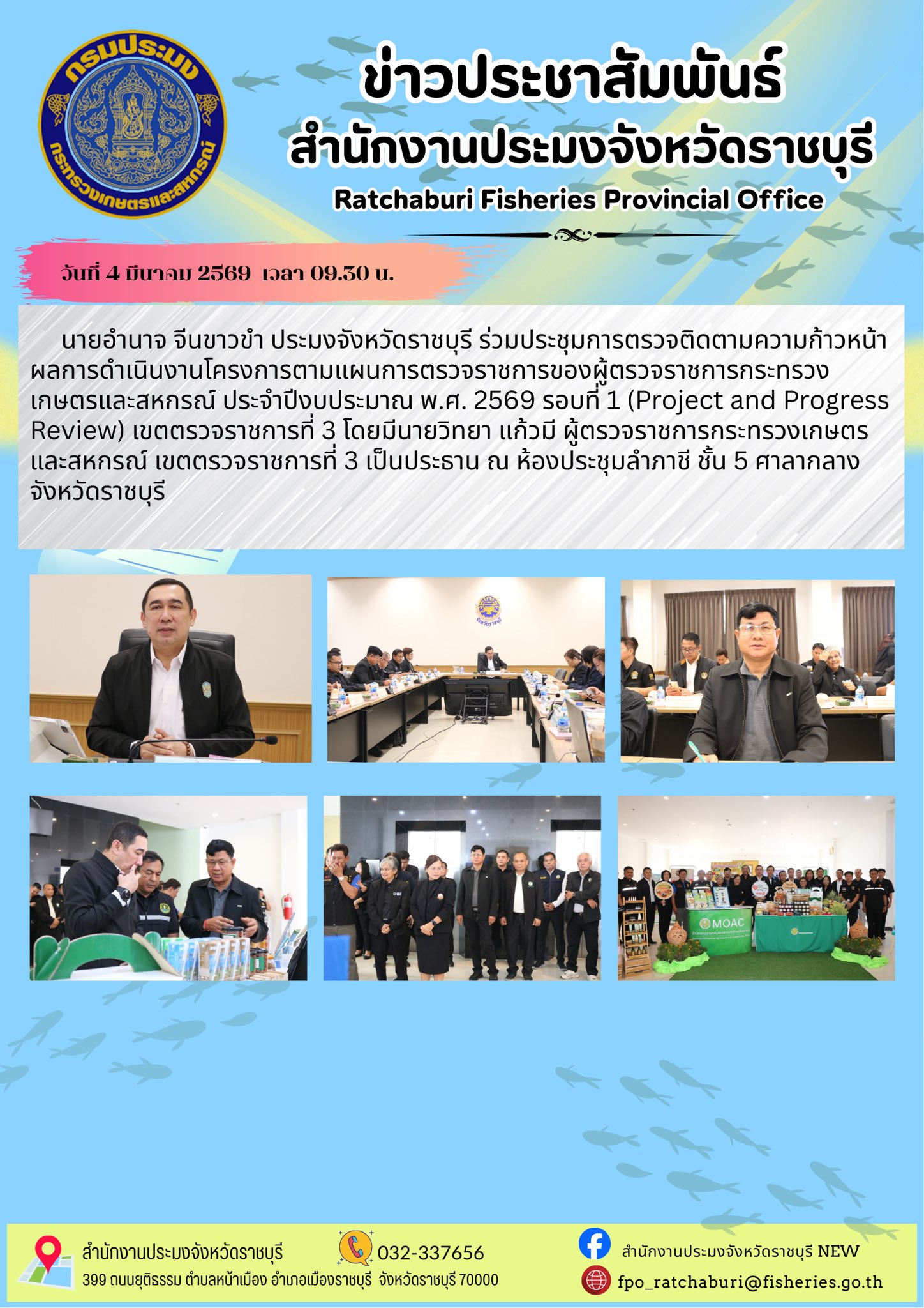 วันที่ 4 มีนาคม 2569 เวลา 09.30 น. นายอำนาจ จีนขาวขำ ประมงจังหวัดราชบุรี ร่วมประชุมการตรวจติดตามความก้าวหน้าผลการดำเนินงานโครงการตามแผนการตรวจราชการของผู้ตรวจราชการกระทรวงเกษตรและสหกรณ์ ประจำปีงบประมาณ พ.ศ. 2569 รอบที่ 1 (Project and Progress Review) เขตตรวจราชการที่ 3 โดยมีนายวิทยา แก้วมี ผู้ตรวจราชการกระทรวงเกษตรและสหกรณ์ เขตตรวจราชการที่ 3 เป็นประธาน ณ ห้องประชุมลำภาชี ชั้น 5 ศาลากลางจังหวัดราชบุรี