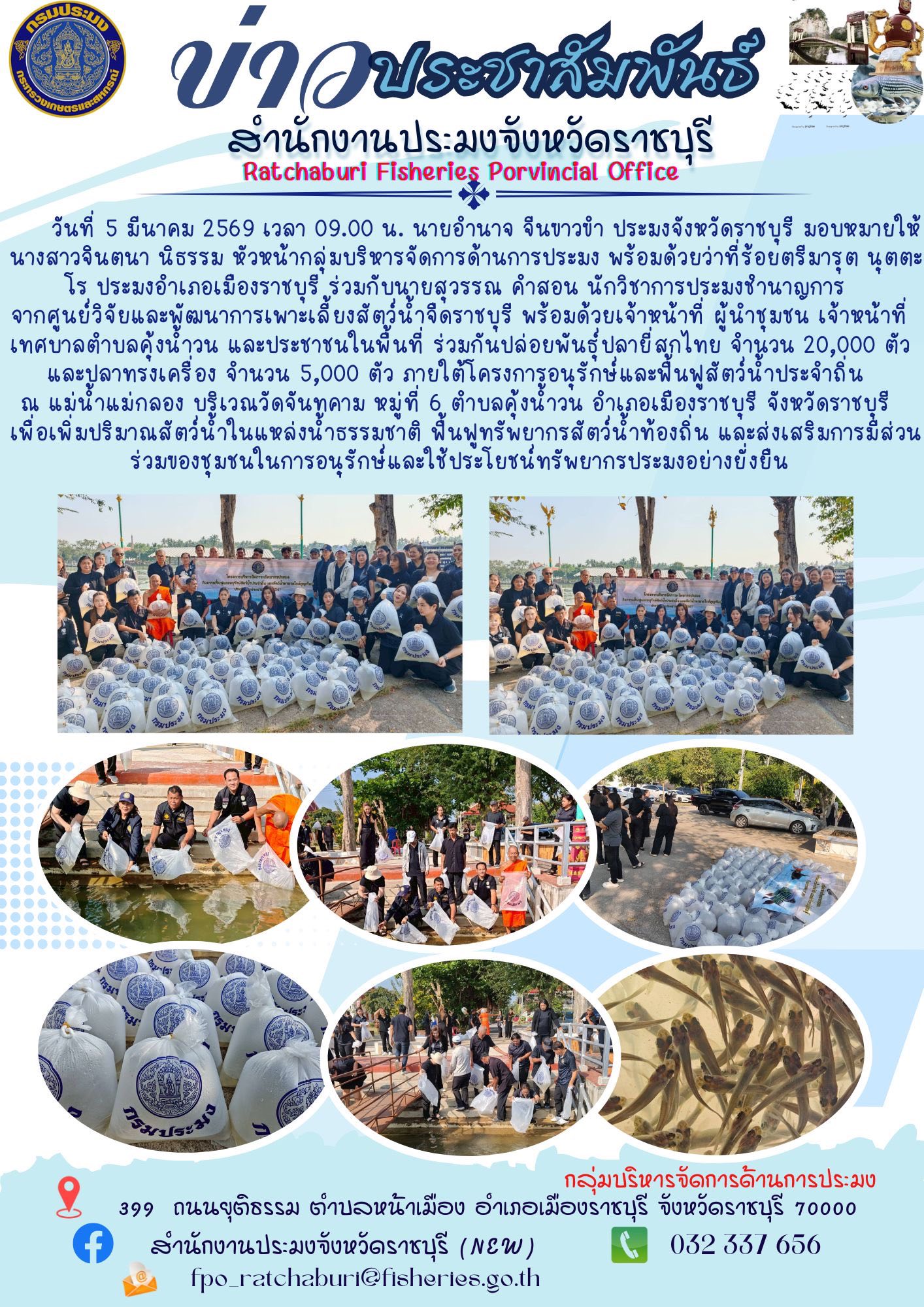 วันที่ 5 มีนาคม 2569 เวลา 09.00 น. นายอำนาจ จีนขาวขำ ประมงจังหวัดราชบุรี มอบหมายให้นางสาวจินตนา นิธรรม หัวหน้ากลุ่มบริหารจัดการด้านการประมง พร้อมด้วยว่าที่ร้อยตรีมารุต นุตตะโร ประมงอำเภอเมืองราชบุรี ร่วมกับนายสุวรรณ คำสอน นักวิชาการประมงชำนาญการ จากศูนย์วิจัยและพัฒนาการเพาะเลี้ยงสัตว์น้ำจืดราชบุรี พร้อมด้วยเจ้าหน้าที่ ผู้นำชุมชน เจ้าหน้าที่เทศบาลตำบลคุ้งน้ำวน และประชาชนในพื้นที่ ร่วมกันปล่อยพันธุ์ปลายี่สกไทย จำนวน 20,000 ตัว และปลาทรงเครื่อง จำนวน 5,000 ตัว ภายใต้โครงการอนุรักษ์และฟื้นฟูสัตว์น้ำประจำถิ่น ณ แม่น้ำแม่กลอง บริเวณวัดจันทคาม หมู่ที่ 6 ตำบลคุ้งน้ำวน อำเภอเมืองราชบุรี จังหวัดราชบุรี เพื่อเพิ่มปริมาณสัตว์น้ำในแหล่งน้ำธรรมชาติ ฟื้นฟูทรัพยากรสัตว์น้ำท้องถิ่น และส่งเสริมการมีส่วนร่วมของชุมชนในการอนุรักษ์และใช้ประโยชน์ทรัพยากรประมงอย่างยั่งยืน