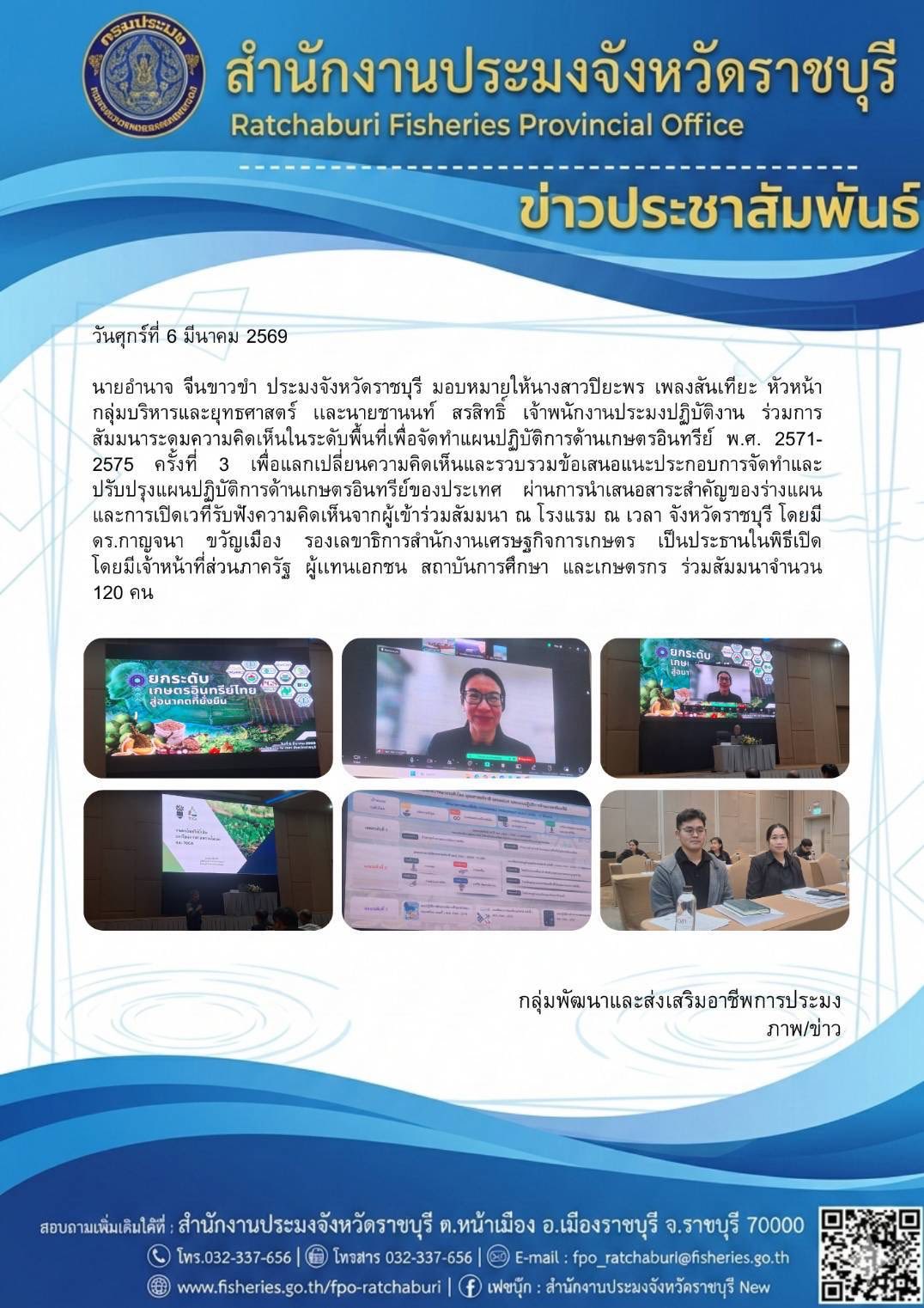 วันศุกร์ที่ 6 มีนาคม 2569 นายอำนาจ จีนขาวขำ ประมงจังหวัดราชบุรี มอบหมายให้นางสาวปิยะพร เพลงสันเทียะ หัวหน้ากลุ่มบริหารและยุทธศาสตร์ เเละนายชานนท์ สรสิทธิ์ เจ้าพนักงานประมงปฏิบัติงาน ร่วมการสัมมนาระดมความคิดเห็นในระดับพื้นที่เพื่อจัดทำแผนปฏิบัติการด้านเกษตรอินทรีย์ พ.ศ. 2571-2575 ครั้งที่ 3 เพื่อแลกเปลี่ยนความคิดเห็นและรวบรวมข้อเสนอแนะประกอบการจัดทำและปรับปรุงแผนปฏิบัติการด้านเกษตรอินทรีย์ของประเทศ ผ่านการนำเสนอสาระสำคัญของร่างแผนและการเปิดเวทีรับฟังความคิดเห็นจากผู้เข้าร่วมสัมมนา ณ โรงแรม ณ เวลา จังหวัดราชบุรี โดยมี ดร.กาญจนา ขวัญเมือง รองเลขาธิการสำนักงานเศรษฐกิจการเกษตร เป็นประธานในพิธีเปิด และมีเจ้าหน้าที่ส่วนภาครัฐ ผู้เเทนเอกชน สถาบันการศึกษา และเกษตรกร ร่วมสัมมนาจำนวน 120 คน