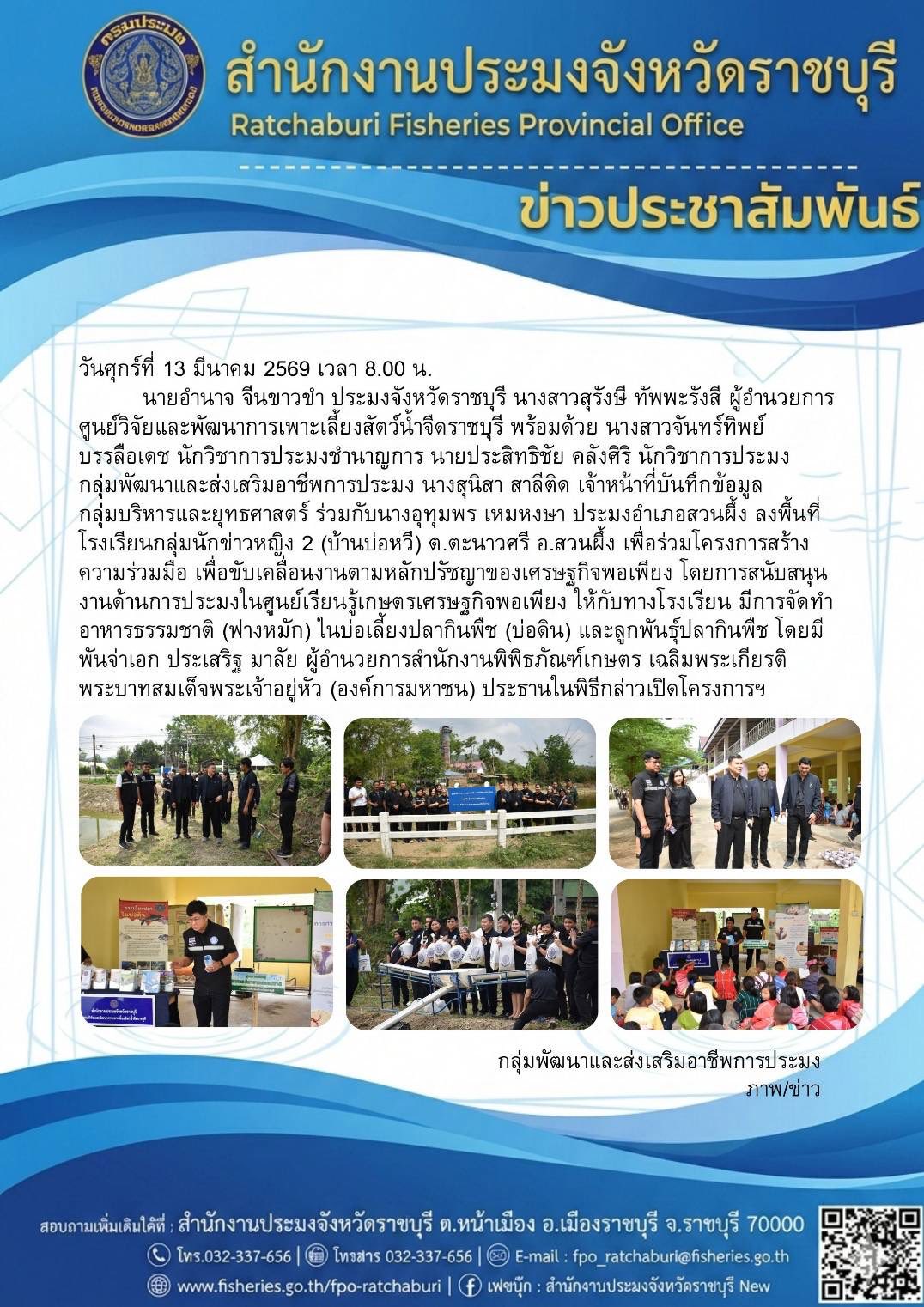 วันศุกร์ที่ 13 มีนาคม 2569 นายอำนาจ จีนขาวขำ ประมงจังหวัดราชบุรี นางสาวสุรังษี ทัพพะรังสี ผู้อำนวยการศูนย์วิจัยและพัฒนาการเพาะเลี้ยงสัตว์น้ำจืดราชบุรี พร้อมด้วย นางสาวจันทร์ทิพย์ บรรลือเดช นักวิชาการประมงชำนาญการ นายประสิทธิชัย คลังศิริ นักวิชาการประมง กลุ่มพัฒนาและส่งเสริมอาชีพการประมง นางสุนิสา สาลีติด เจ้าหน้าที่บันทึกข้อมูล กลุ่มบริหารและยุทธศาสตร์ ร่วมกับนางอุทุมพร เหมหงษา ประมงอำเภอสวนผึ้ง ลงพื้นที่ โรงเรียนกลุ่มนักข่าวหญิง 2 (บ้านบ่อหวี) ต.ตะนาวศรี อ.สวนผึ้ง เพื่อร่วมโครงการสร้างความร่วมมือ เพื่อขับเคลื่อนงานตามหลักปรัชญาของเศรษฐกิจพอเพียง โดยการสนับสนุนงานด้านการประมงในศูนย์เรียนรู้เกษตรเศรษฐกิจพอเพียง ให้กับทางโรงเรียน มีการจัดทำอาหารธรรมชาติ (ฟางหมัก) ในบ่อเลี้ยงปลากินพืช (บ่อดิน) และลูกพันธุ์ปลากินพืช โดยมีพันจ่าเอก ประเสริฐ มาลัย ผู้อำนวยการสำนักงานพิพิธภัณฑ์เกษตรเฉลิมพระเกียรติ พระบาทสมเด็จพระเจ้าอยู่หัว (องค์การมหาชน) ประธานในพิธีกล่าวเปิดโครงการฯ