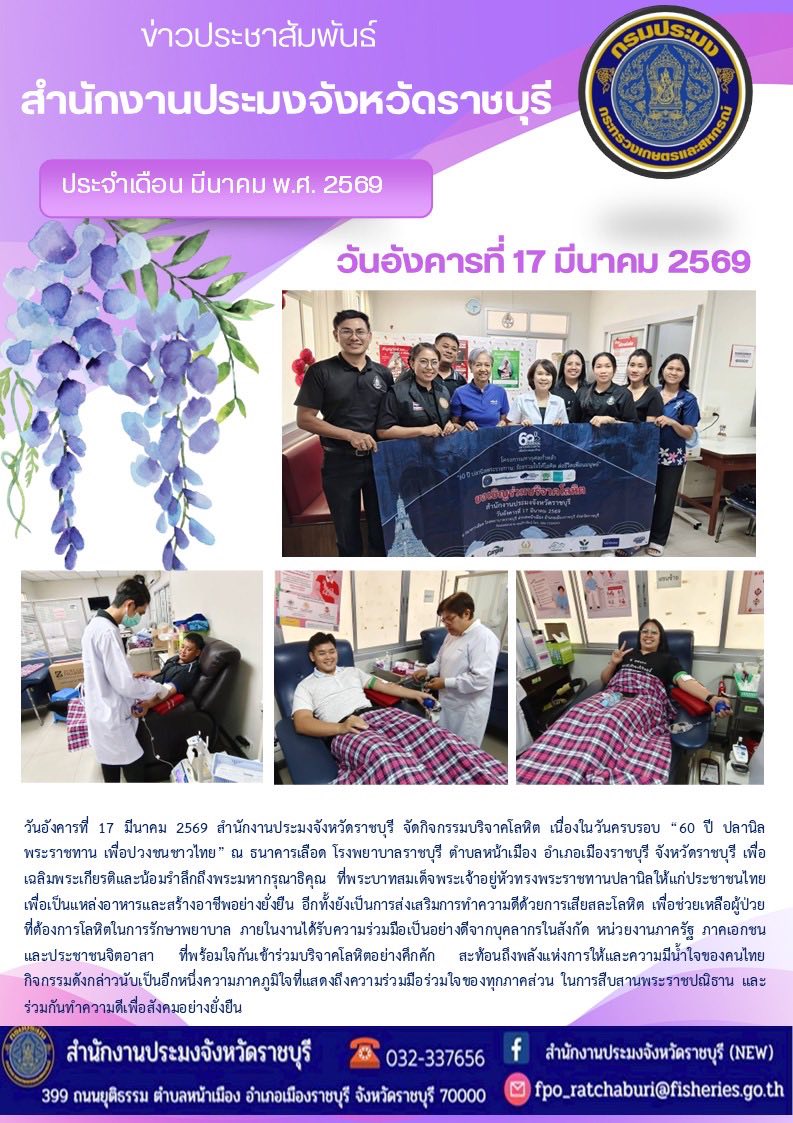 วันอังคารที่ 17 มีนาคม 2569 สำนักงานประมงจังหวัดราชบุรี จัดกิจกรรมบริจาคโลหิต เนื่องในวันครบรอบ “60 ปี ปลานิลพระราชทาน เพื่อปวงชนชาวไทย” ณ ธนาคารเลือด โรงพยาบาลราชบุรี ตำบลหน้าเมือง อำเภอเมืองราชบุรี จังหวัดราชบุรี เพื่อเฉลิมพระเกียรติและน้อมรำลึกถึงพระมหากรุณาธิคุณ ที่พระบาทสมเด็จพระเจ้าอยู่หัวทรงพระราชทานปลานิลให้แก่ประชาชนไทย เพื่อเป็นแหล่งอาหารและสร้างอาชีพอย่างยั่งยืน อีกทั้งยังเป็นการส่งเสริมการทำความดีด้วยการเสียสละโลหิต เพื่อช่วยเหลือผู้ป่วยที่ต้องการโลหิตในการรักษาพยาบาล ภายในงานได้รับความร่วมมือเป็นอย่างดีจากบุคลากรในสังกัด หน่วยงานภาครัฐ ภาคเอกชน และประชาชนจิตอาสา ที่พร้อมใจกันเข้าร่วมบริจาคโลหิตอย่างคึกคัก สะท้อนถึงพลังแห่งการให้และความมีน้ำใจของคนไทย กิจกรรมดังกล่าวนับเป็นอีกหนึ่งความภาคภูมิใจ ที่แสดงถึงความร่วมมือร่วมใจของทุกภาคส่วน ในการสืบสานพระราชปณิธาน และร่วมกันทำความดีเพื่อสังคมอย่างยั่งยืน