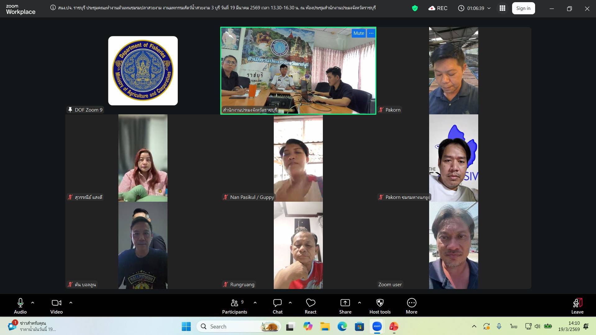 วันพฤหัสบดีที่ 19 มีนาคม 2569 นายอำนาจ จีนขาวขำ ประมงจังหวัดราชบุรี พร้อมเจ้าหน้าที่สำนักงานประมงจังหวัดราชบุรี จัดการประชุมคณะทำงานกิจกรรมการจัดการประกวดและแข่งขัน “มหกรรมสัตว์น้ำสวยงาม 3 บุรี” ณ ห้องประชุมสำนักงานประมงจังหวัดราชบุรี และผ่านระบบ ZoomCloud Meeting โดยมีผู้แทนปลาสวยงามทั้ง 7 ชนิด ร่วมประชุมหารือ การประชุมในครั้งนี้นับเป็นอีกก้าวสำคัญของการบูรณาการความร่วมมือเพื่อให้การจัดงาน “มหกรรมสัตว์น้ำสวยงาม 3 บุรี” เป็นไปอย่างมีประสิทธิภาพและบรรลุวัตถุประสงค์ที่กำหนดไว้