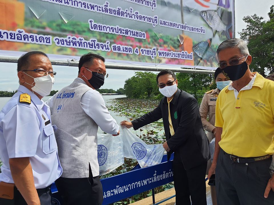 วันที่ 13 กรกฎาคม 2563 สำนักงานประมงจังหวัดราชบุรี นำโดย นายประวิทย์ ละออบุตร ประมงจังหวัดราชบุรี ร่วมกับศูนย์วิจัยและพัฒนาการเพาะเลี้ยงสัตว์น้ำจืดและเทศบาลตำบลกระจับ จัดกิจกรรมปล่อยพันธุ์สัตว์น้ำเพื่อฟื้นฟูทรัพยากรสัตว์น้ำในบึงกระจับ โดยมี นายนราพัฒน์ แก้วทอง ผู้ช่วยรัฐมนตรีประจำกระทรวงเกษตรและสหกรณ์ เป็นประธานในพิธี ทั้งนี้มี นายเกียรติศักดิ์ ตรงศิริ รองผู้ว่าราชการจังหวัดราชบุรี พร้อมหัวหน้าส่วนราชการ ข้าราชการและประชาชนในพื้นที่ให้การต้อนรับ โดยภายในกิจกรรมมีการปล่อยพันธุ์ปลาน้ำจืดรวมกว่า 300,000 ตัว ประกอบด้วย ปลาตะเพียนทองจำนวน 150,000 ตัว ปลาตะเพียนขาว 100,000 ตัว ปลาแก้มช้ำจำนวน 50,000 ตัว นอกจากนี้ยังมีการปล่อยปลากระโห้ และปลายี่สกไทย ซึ่งเป็นปลาประจำจังหวัดราชบุรี ลงแหล่งน้ำดังกล่าวเพื่อให้ได้ขยายพันธุ์ต่อไปในอนาคตอีกด้วย