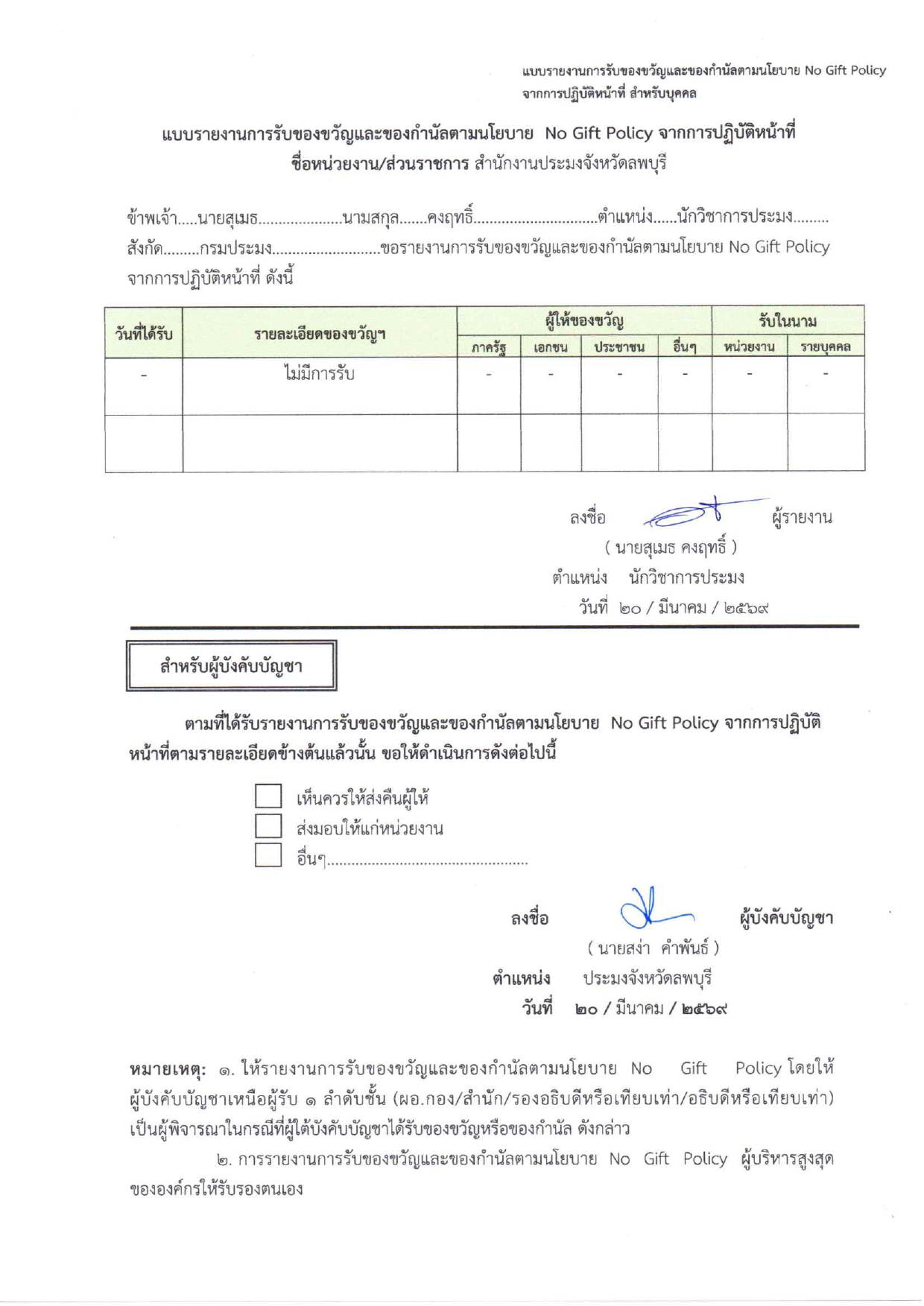 รายงานทรัพย์สินหรือประโยชน์อื่นใดอันอาจคำนวณเเป็นเเงินได้ ตามประกาศคณะกรรมการป้องกันและปราบปรามการทุจริตแห่งชาติ และรายงานผลการดำเนินงานตามนโยบาย No Gift Policy