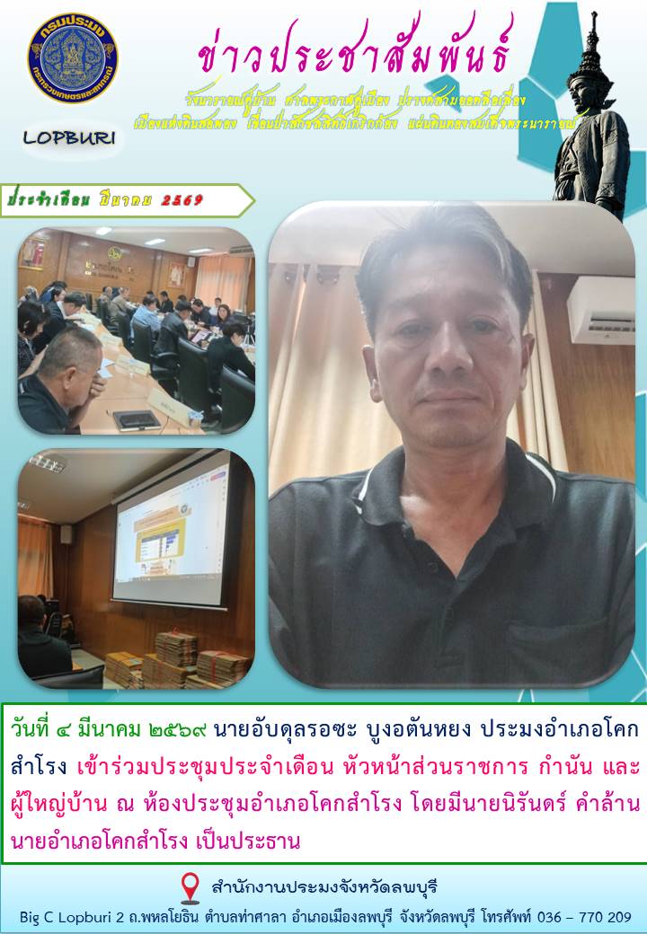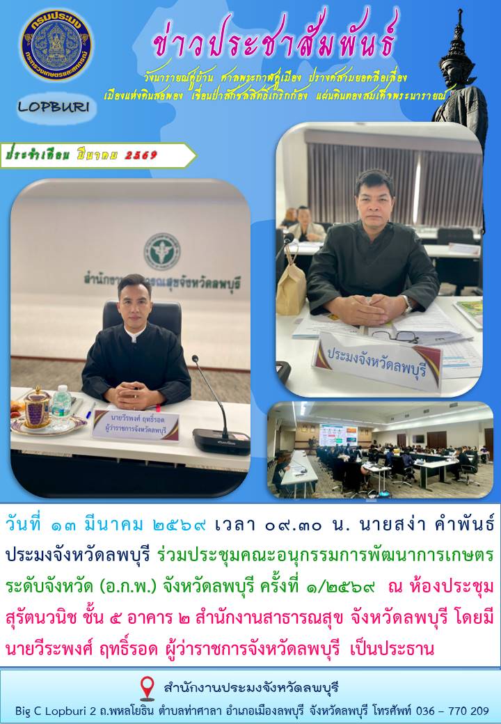 • การขายทอดตลาดครุภัณฑ์ชำรุด การขายทอดตลาดครุภัณฑ์ชำรุด  จำนวนผู้อ่าน 282  ์การรับสมัครบุคคลเพื่อเลือกสรรเป็นพนักงานราชการทั่วไป ์การรับสมัครบุคคลเพื่อเลือกสรรเป็นพนักงานราชการทั่วไป  จำนวนผู้อ่าน 278 ข่าวประชาสัมพันธ์ ประจำเดือน ตุลาคม พ.ศ.2568 ข่าวประชาสัมพันธ์ ประจำเดือน ตุลาคม พ.ศ.2568  จำนวนผู้อ่าน 217 ข่าวประชาสัมพันธ์ ประจำเดือน พฤศจิกายน พ.ศ.2568 ข่าวประชาสัมพันธ์ ประจำเดือน พฤศจิกายน พ.ศ.2568  จำนวนผู้อ่าน 181 งานแผ่นดินสมเด็จพระนารายณ์มหาราช ประจำปี 2569 ตั่งแต่ 13 - 22 กุมภาพันธ์ 2569 งานแผ่นดินสมเด็จพระนารายณ์มหาราช ประจำปี 2569 ตั่งแต่ 13 - 22 กุมภาพันธ์ 2569  จำนวนผู้อ่าน 137 ข่าวประชาสัมพันธ์ ประจำเดือน ธันวาคม พ.ศ.2568 ข่าวประชาสัมพันธ์ ประจำเดือน ธันวาคม พ.ศ.2568  จำนวนผู้อ่าน 122 นโยบายการกำกับดูแลองค์การที่ดี กรมประมง ประจำปีงบประมาณ พ.ศ. 2569 นโยบายการกำกับดูแลองค์การที่ดี กรมประมง ประจำปีงบประมาณ พ.ศ. 2569  จำนวนผู้อ่าน 119 การรับสมัครบุคคลเข้ารับการคัดเลือกเพื่อแต่งตั้งเป็นกรรมการผู้ทรงคุณวุฒิในคณะกรรมการประมงประจำจังหวัด (สามารถดาวน์โหลดเอกสารและใบสมัครได้ในช่องทางนี้) การรับสมัครบุคคลเข้ารับการคัดเลือกเพื่อแต่งตั้งเป็นกรรมการผู้ทรงคุณวุฒิในคณะกรรม... จำนวนผู้อ่าน 114 ธ สถิตในดวงใจไทยนิรันดร์ ธ สถิตในดวงใจไทยนิรันดร์  จำนวนผู้อ่าน 107 การลงนามรับทราบประกาศเจตนารมณ์  การลงนามรับทราบประกาศเจตนารมณ์ "สุจริต โปร่งใส งดรับ งดให้" ของขวัญ ของกำนัลทุกช... จำนวนผู้อ่าน 106 กรมประมงชูผลสำเร็จการเพาะพันธุ์ “ปลาน้ำเงิน” ด้วยเทคนิคใหม่ ที่ช่วยลดการสูญเสียพ่อแม่พันธุ์ ส่งเสริมการพัฒนาสู่สัตว์น้ำเศรษฐกิจมูลค่าสูง ควบคู่การฟื้นฟูทรัพยากรในระบบนิเวศอย่างยั่งยืน กรมประมงชูผลสำเร็จการเพาะพันธุ์ “ปลาน้ำเงิน” ด้วยเทคนิคใหม่ ที่ช่วยลดการสูญเสียพ... จำนวนผู้อ่าน 100 ข่าวประชาสัมพันธ์ ประจำเดือน มกราคม พ.ศ.2569 ข่าวประชาสัมพันธ์ ประจำเดือน มกราคม พ.ศ.2569  จำนวนผู้อ่าน 88 คำสั่งจังหวัดลพบุรี เรื่อง แต่งตั้งกรรมการผู้ทรงคุณวุฒิในคณะกรรมการประมงประจำจังหวัดลพบุรี คำสั่งจังหวัดลพบุรี เรื่อง แต่งตั้งกรรมการผู้ทรงคุณวุฒิในคณะกรรมการประมงประจำจัง... จำนวนผู้อ่าน 84 ข่าวประชาสัมพันธ์ ประจำเดือน กุมภาพันธ์ พ.ศ.2569 ข่าวประชาสัมพันธ์ ประจำเดือน กุมภาพันธ์ พ.ศ.2569  จำนวนผู้อ่าน 81 ประชาสัมพันธ์งานมหกรรมพืชสวนโลกจังหวัดอุดรธานี 1 พ.ย.69 - 14 มี.ค.70 ?เชิญชวนเข้าร่วมงานมหกรรมพืชสวนโลก 2569 ณ จังหวัดอุดรธานี  ??1 พฤศจิกายน 2569 – 14 มีนาคม 2570 ?? ณ บริเวณพื้นที่ชุ่มน้ำหนองแด ตำบลกุดสระ อำ