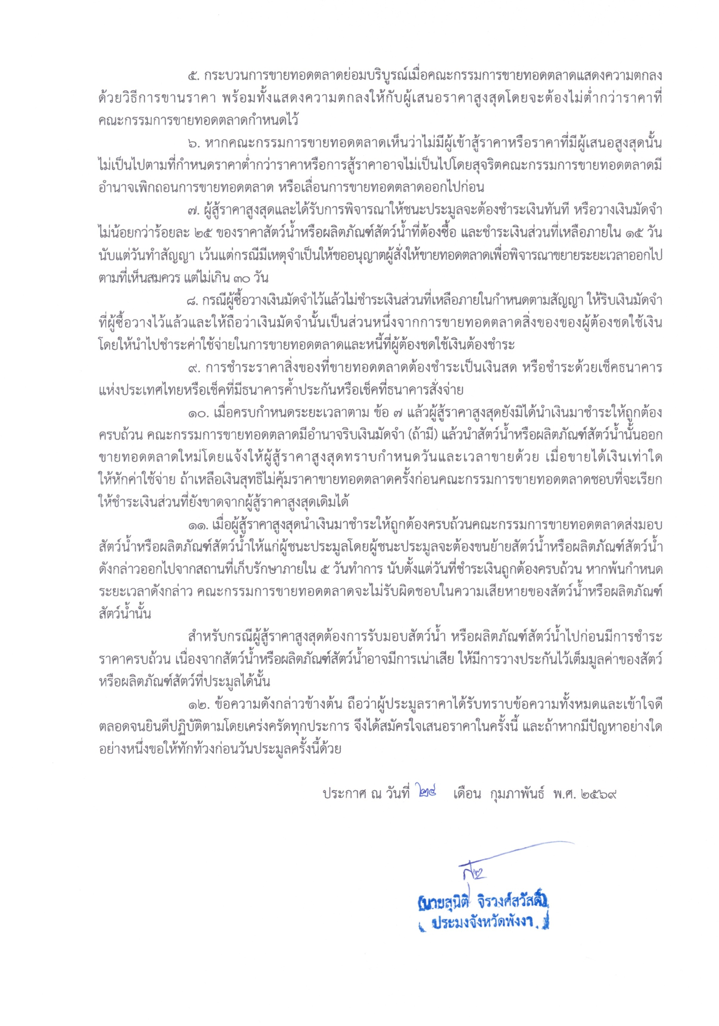 ??กำหนดการประมูลขายทอดตลาด ในวันที่ 26 กุมภาพันธ์ 2569 ณ แพเจริญสิน เลขที่ 139/132 หมู่ที่ 3 ตำบลคุระ อำเภอคุระบุรี จังหวัดพังงา การประมูลจะเริ่ม ในเวลา 10.30 น. เพื่อให้ทุกท่านได้รับชมสภาพผลิตภัณฑ์สัตว์น้ำขายทอดตลาด และเริ่มประมูลในเวลา 11.00 น. โดยมีสัตว์น้ำหรือผลิตภัณฑ์สัตว์น้ำที่พนักงานเจ้าหน้าที่สั่งยึดไว้ จำนวน 6 รายการ ปริมาณรวม 448 กิโลกรัม ดังนี้