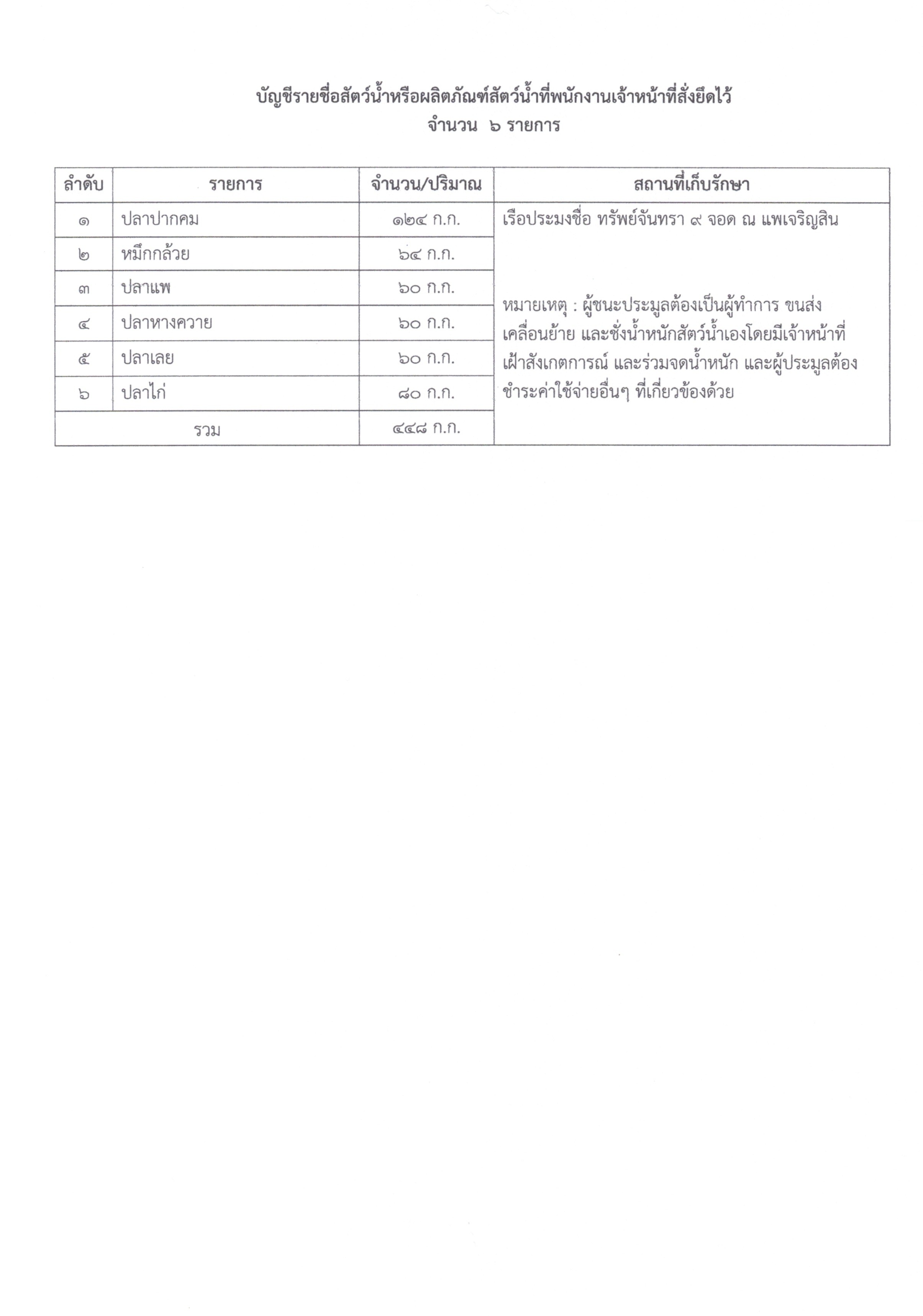 ??หมายเหตุ : ผู้ชนะประมูลต้องเป็นผู้ทำการ ขนส่ง เคลื่นย้าย และชั่งน้ำสัตว์น้ำเองโดยมีเจ้าหน้าที่เฝ้าสังเกตการณ์ และร่วมจดน้ำหนัก และผู้ประมูลต้องชำระค่าใช้จ่ายอื่นๆ ที่เกี่ยวข้องด้วย