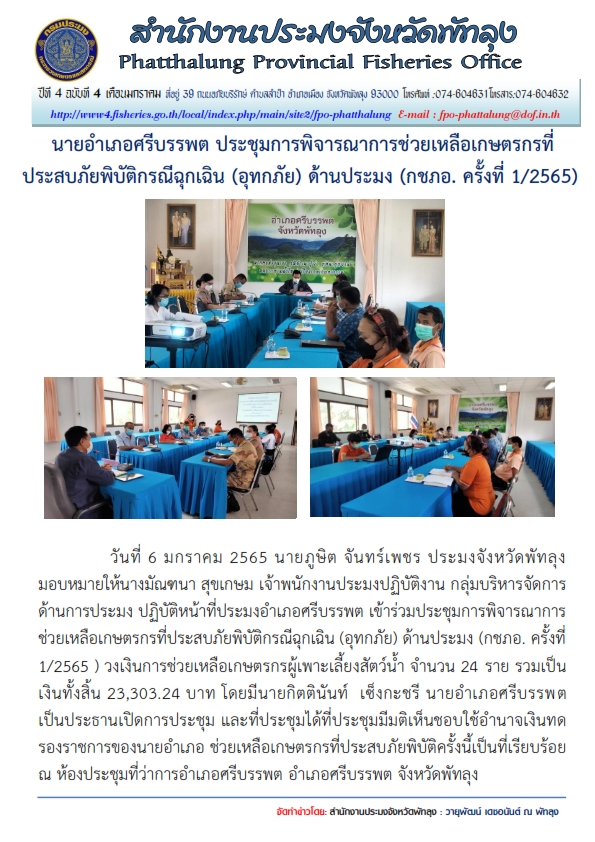 นายอำเภอศรีบรรพต  ประชุมการพิจารณาการฃ่วยเหลือเกษตรกรที่ประสบภัยพิบัิตกรณีฉุกเฉิน (อุทกภัย) ด้านประมง (กชภอ. ครั้งที่ 1/2565)..คลิก