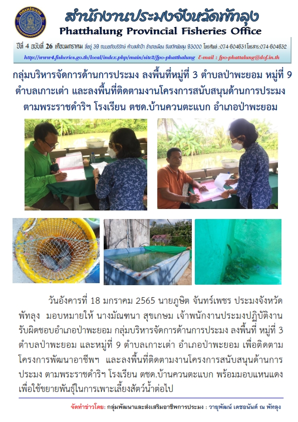 วันอังคารที่ 18 มกราคม 2565 นายภูษิต จันทร์เพชร ประมงจังหวัดพัทลุง  มอบหมายให้ นางมัณฑนา สุขเกษม เจ้าพนักงานประมงปฏิบัติงาน รับผิดชอบอำเภอป่าพะยอม กลุ่มบริหารจัดการด้านการ ลงพื้นที่ หมู่ที่ 3 ตำบลป่าพะยอม และหมู่ที่ 9 ตำบลเกาะเต่า อำเภอป่าพะยอม เพื่อติดตามโครงการพัฒนาอาชีพฯ  และลงพื้นที่ติดตามงานโครงการสนับสนุนด้านการประมง    ตามพระราชดำริฯ โรงเรียน ตชด.บ้านควนตะแบก พร้อมมอบแหนแดงเพื่อใช้ขยายพันธุ์ในการเพาะเลี้ยงสัตว์น้ำต่อไป