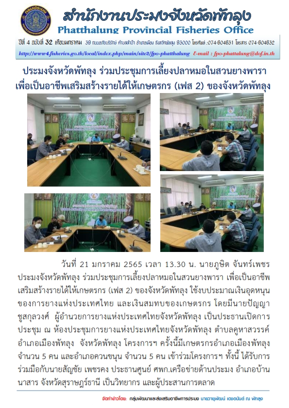 ประมงจังหวัดพัทลุง ร่วมประชุมการเลี้ยงปลาหมอในสวนยางพารา เพื่อเป็นอาชีพเสริมสร้างรายได้ให้เกษตรกร (เฟส 2) ของจังหวัดพัทลุง