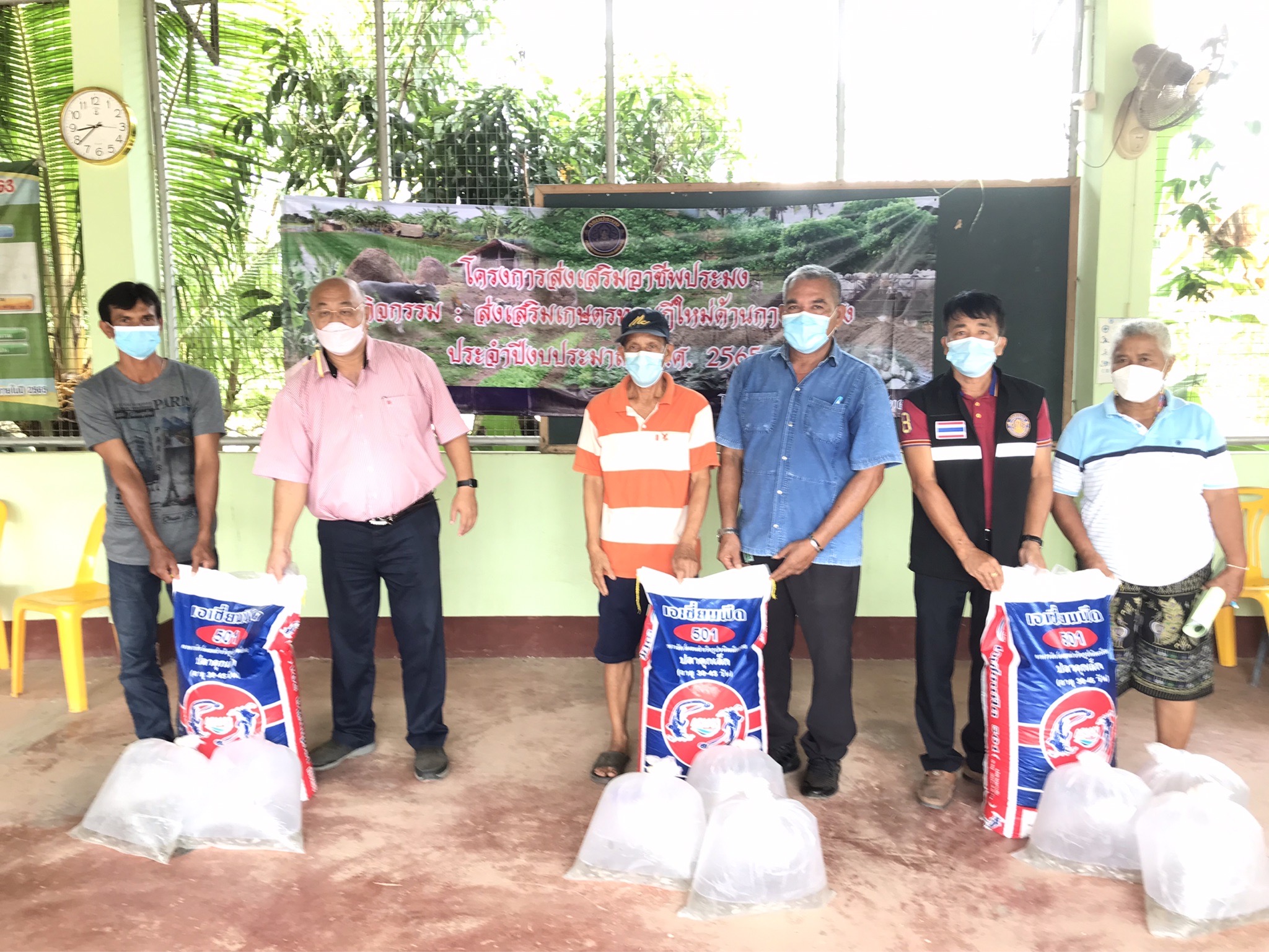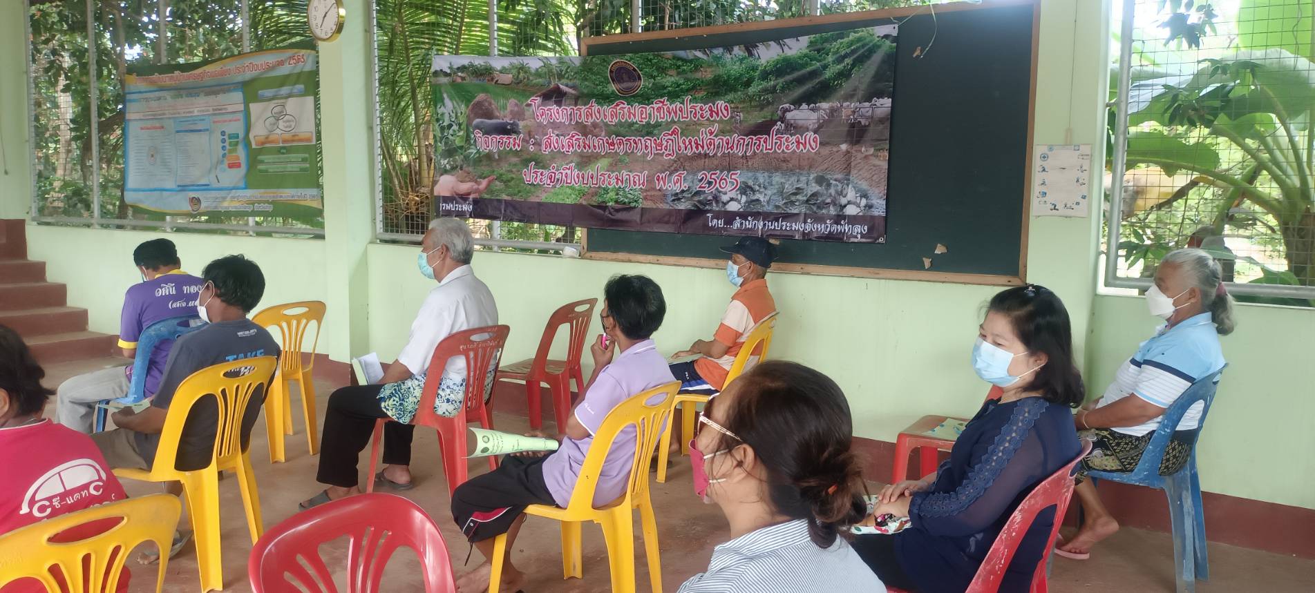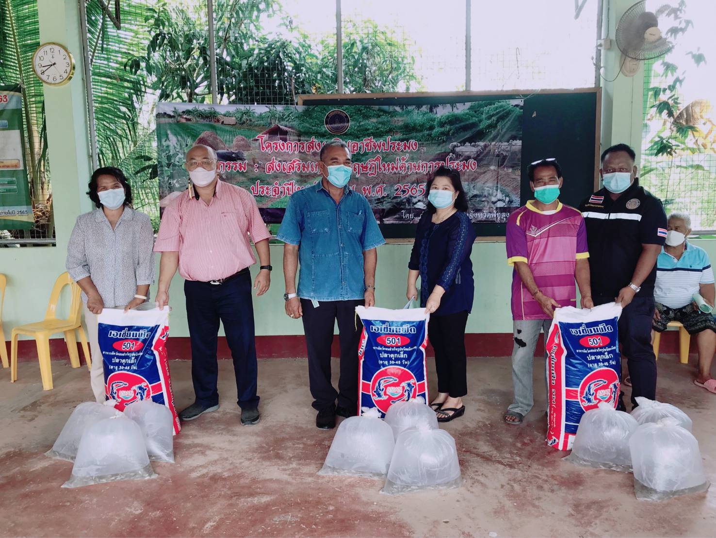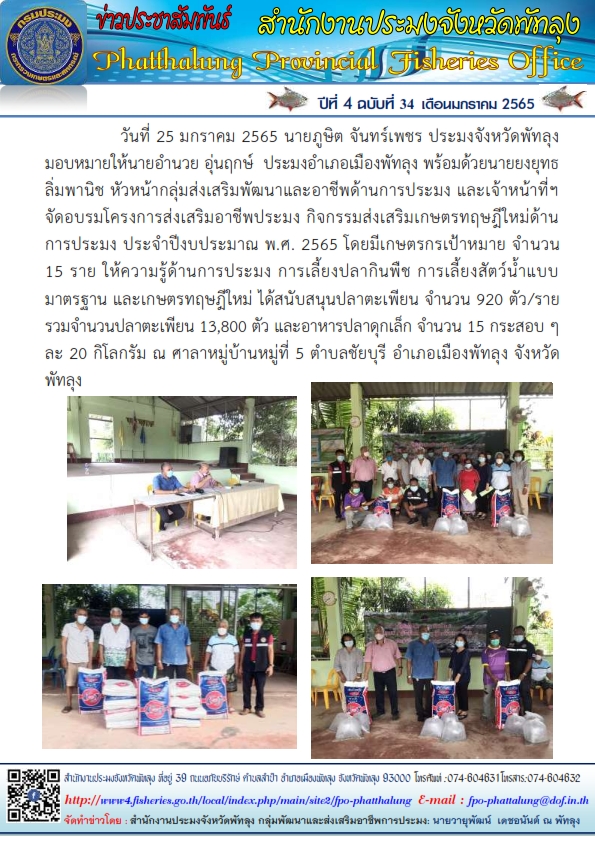 วันที่ 25 มกราคม 2565 นายภูษิต จันทร์เพชร ประมงจังหวัดพัทลุง มอบหมายให้นายอำนวย อุ่นฤกษ์  ประมงอำเภอเมืองพัทลุง พร้อมด้วยนายยงยุทธ  ลิ่มพานิช หัวหน้ากลุ่มส่งเสริมพัฒนาและอาชีพด้านการประมง และเจ้าหน้าที่ฯ จัดอบรมโครงการส่งเสริมอาชีพประมง กิจกรรมส่งเสริมเกษตรทฤษฎีใหม่ด้าน การประมง ประจำปีงบประมาณ พ.ศ. 2565 โดยมีเกษตรกรเป้าหมาย จำนวน 15 ราย ให้ความรู้ด้านการประมง การเลี้ยงปลากินพืช การเลี้ยงสัตว์น้ำแบบมาตรฐาน และเกษตรทฤษฎีใหม่ ได้สนับสนุนปลาตะเพียน จำนวน 920 ตัว/รายรวมจำนวนปลาตะเพียน 13,800 ตัว และอาหารปลาดุกเล็ก จำนวน 15 กระสอบ ๆ ละ 20 กิโลกรัม ณ ศาลาหมู่บ้านหมู่ที่ 5 ตำบลชัยบุรี อำเภอเมือง