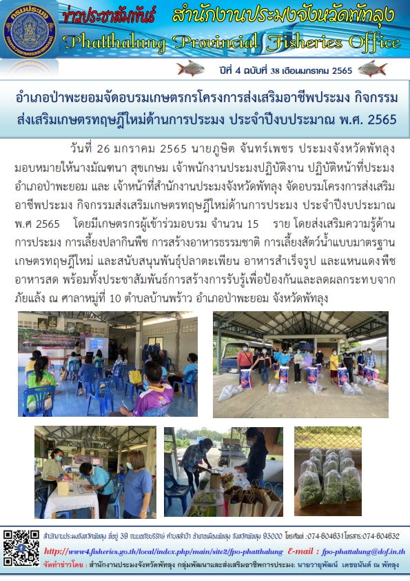 วันที่ 26 มกราคม 2565 นายภูษิตจันทร์เพชร ประมงจังหวัดพัทลุง มอบหมายให้นางมัณฑนา สุขเกษม เจ้าพนักงานประมงปฏิบัติงาน ปฏิบัติหน้าที่ประมงอำเภอป่าพะยอม และ เจ้าหน้าที่สำนักงานประมงจังหวัดพัทลุง จัดอบรมโครงการส่งเสริมอาชีพประมง กิจกรรมส่งเสริมเกษตรทฤษฎีใหม่ด้านการประมง  ประจำปีงบประมาณ พ.ศ 2565 โดยมีเกษตรกรผู้เข้าร่วมอบรม จำนวน 15 ราย โดยส่งเสริมความรู้ด้านการประมง การเลี้ยงปลากินพืช การเลี้ยงสัตว์น้ำแบบมาตรฐาน และเกษตรทฤษฎีใหม่ และสนับสนุนพันธุ์ปลาตะเพียน และอาหาร พร้อมทั้งประชาสัมพันธ์การสร้างการรับรู้เพื่อป้องกันและลดผลกระทบจากภัยแล้งณ ศาลาหมู่ 10 ตำบลบ้านพร้าว อำเภอป่าพะยอม จังหวัดพัทลุง