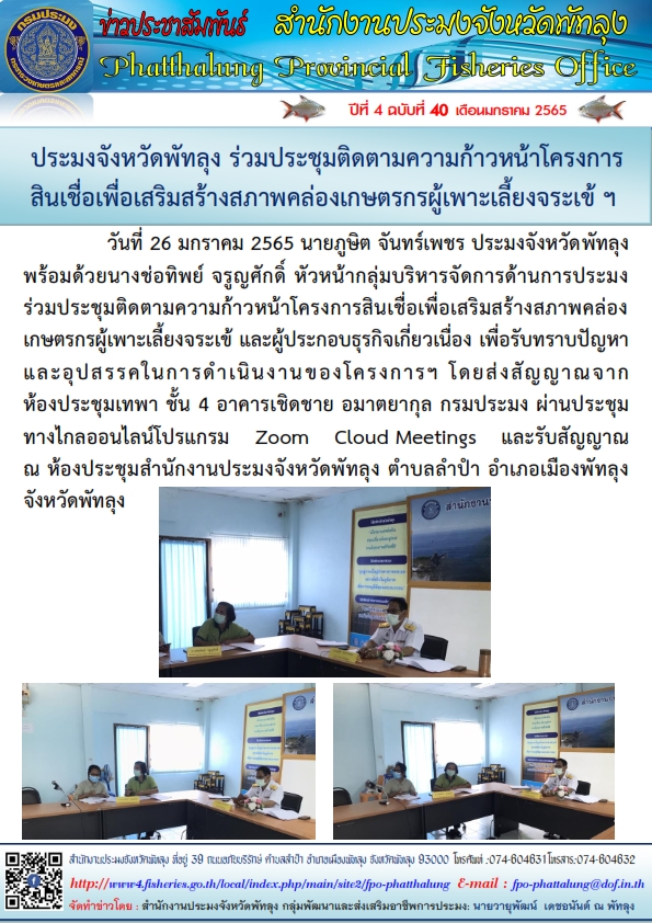 วันที่ 26 มกราคม 2565 นายภูษิต จันทร์เพชร ประมงจังหวัดพัทลุง พร้อมด้วยนางช่อทิพย์ จรูญศักดิ์ หัวหน้ากลุ่มบริหารจัดการด้านการประมง ร่วมประชุมติดตามความก้าวหน้าโครงการสินเชื่อเพื่อเสริมสร้างสภาพคล่องเกษตรกรผู้เพาะเลี้ยงจระเข้ และผู้ประกอบธุรกิจเกี่ยวเนื่อง เพื่อรับทราบปัญหาและอุปสรรคในการดำเนินงานของโครงการฯ โดยส่งสัญญาณจาก ห้องประชุมเทพา ชั้น 4 อาคารเชิดชาย อมาตยากุล กรมประมง ผ่านประชุมทางไกลออนไลน์โปรแกรม Zoom Cloud Meetings และรับสัญญาณ ณ ห้องประชุมสำนักงานประมงจังหวัดพัทลุง ตำบลลำปำ อำเภอเมืองพัทลุง จังหวัดพัทลุง
