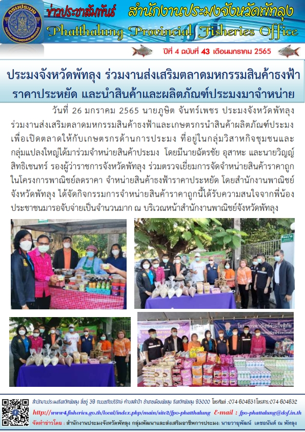 วันที่ 26 มกราคม 2565 นายภูษิต จันทร์เพชร ประมงจังหวัดพัทลุงร่วมงานส่งเสริมตลาดมหกรรมสินค้าธงฟ้าและเกษตรกรนำสินค้าผลิตภัณฑ์ประมงเพื่อเปิดตลาดให้กับเกษตรด้านการประมง ที่อยู่ในกลุ่มวิสาหกิจชุมชนและกลุ่มแปลงใหญ่ได้มาร่วมจำหน่ายสินค้าประมง โดยมีนายฉัตรชัย อุสาหะ และนายวิญญ์ สิทธิเชนทร์ รองผู้ว่าราชการจังหวัดพัทลุง ร่วมตรวจเยี่ยมการจัดจำหน่ายสินค้าราคาถูกในโครงการพาณิชย์ลดราคา จำหน่ายสินค้าธงฟ้าราคาประหยัด โดยสำหนักงานพาณิชย์จังหวัดพัทลุง ได้จัดกิจกรรมการจำหน่ายสินค้าราคาถูกนี้ได้รับความสนใจจากพี่น้องประชาชนมารอจับจ่ายเป็นจำนวนมาก ณ บริเวณหน้าสำนักงานพาณิชย์จังหวัดพัทลุง
