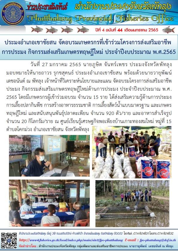 ประมงอำเภอเขาชัยสน จัดอบรมโครงการส่งเสริมอาชีพประมง กิจกรรมส่งเสริมเกษตรทฤษฎีใหม่ด้านการประมง  ประจำปีงบประมาณ พ.ศ 2565..คลิก