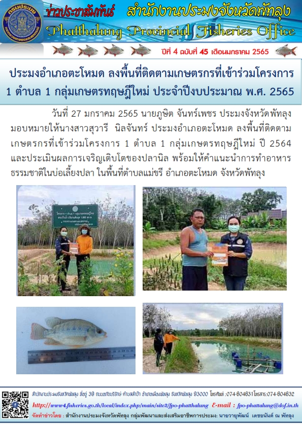 วันที่ 27  มกราคม 2565 นายภูษิต จันทร์เพชร ประมงจังหวัดพัทลุง มอบหมายให้นางสาวสุวารี  นิลจันทร์ ประมงอำเภอตะโหมด ลงพื้นที่ติดตามเกษตรกรที่เข้าร่วมโครงการ 1 ตำบล 1 กลุ่มเกษตรทฤษฎีใหม่ ปี 2564และประเมินผลการเลี้ยงปลานิล พร้อมให้คำแนะนำการทำอาหารธรรมชาติในบ่อเลี้ยงปลา ในพื้นที่ ต.แม่ขรี อ.ตะโหมด จังหวัดพัทลุง