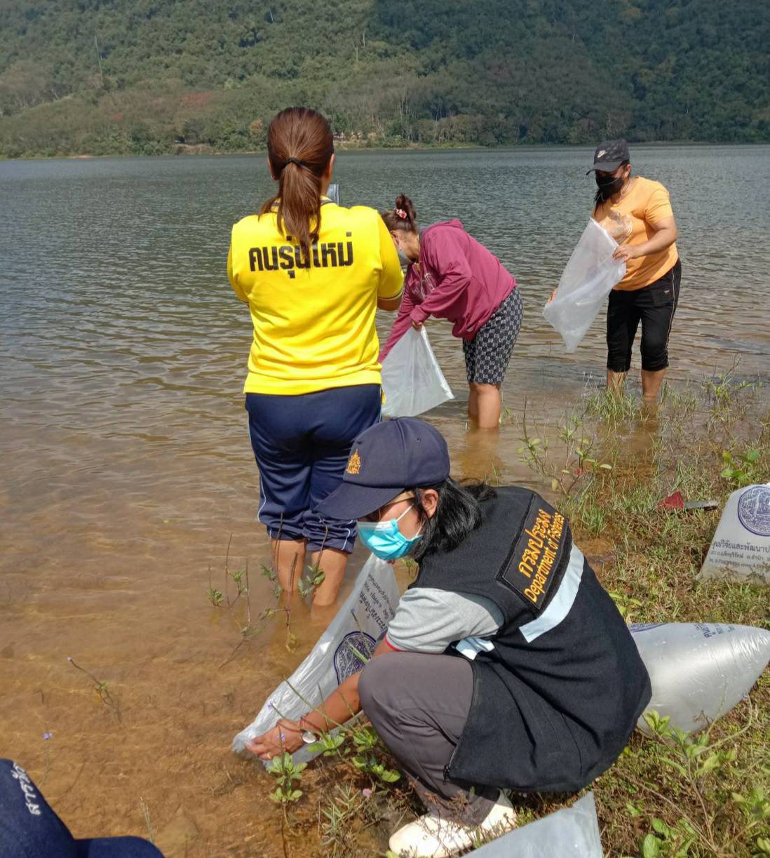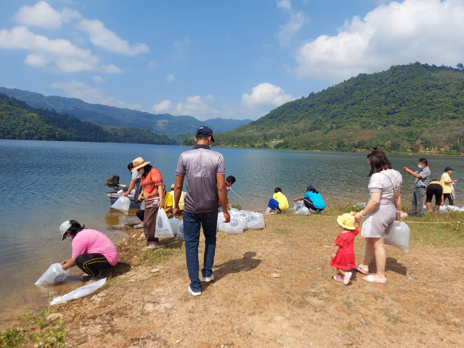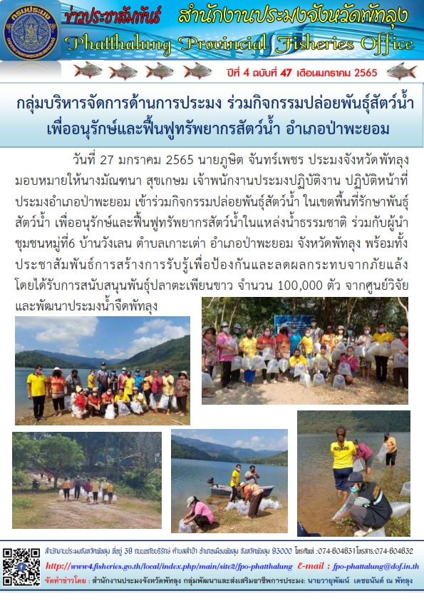 วันที่ 27 มกราคม 2565 นายภูษิตจันทร์เพชร ประมงจังหวัดพัทลุง มอบหมายให้นางมัณฑนา สุขเกษม เจ้าพนักงานประมงปฏิบัติงาน ปฏิบัติหน้าที่ประมงอำเภอป่าพะยอม เข้าร่วมกิจกรรมปล่อยพันธุ์สัตว์น้ำ ในเขตพื้นที่รักษาพันธํสัตว์น้ำ เพื่ออนุรักษ์และฟื้นฟูทรัพยากรสัตว์น้ำในแหล่งน้ำธรรมชาติ ร่วมกับผู้นำชุมชนหมู่ที่6 บ้านวังเลน ตำบลเกาะเต่า อำเภอป่าพะยอม จังหวัดพัทลุง พร้อมทั้งประชาสัมพันธ์การสร้างการรับรู้เพื่อป้องกันและลดผลกระทบจากภัยแล้ง โดยได้รับการสนับสนุนพันธุ์ปลาตะเพียนขาว จำนวน 100,000 ตัว จากศูนย์วิจัยและพัฒนาประมงน้ำจืดพัทลุง