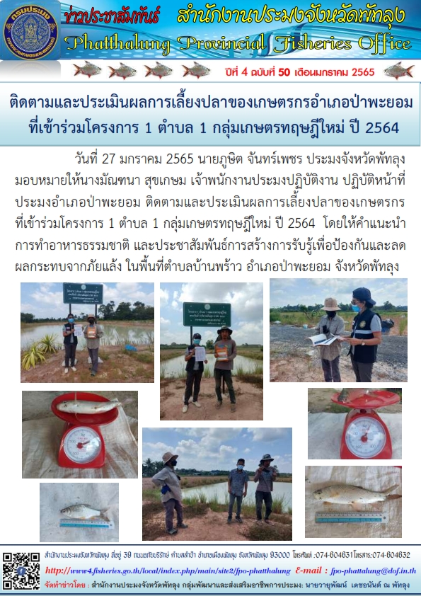 วันที่ 27 มกราคม 2565 นายภูษิต จันทร์เพชร ประมงจังหวัดพัทลง มอบหมายให้นางมัณฑนา สุขเกษม เจ้าพนักงานประมงปฏิบัติงาน ปฏิบัติหน้าที่ประมงอำเภอป่าพะยอม ติดตามและประเมินผลการเลี้ยงปลาของเกษตรกรที่เข้าร่วมโครงการ 1 ตำบล 1 กลุ่มเกษตรทฤษฎีใหม่ ปี 2564 โดยให้คำแนะนำการทำอาหารธรรมชาติ และประชาสัมพันธ์การสร้างการรับรู้เพื่อป้องกันและลดผลกระทบจากภัยแล้ง ในพื้นที่ตำบลบ้านพร้าว อำเภอป่าพะยอม จังหวัดพัทลุง