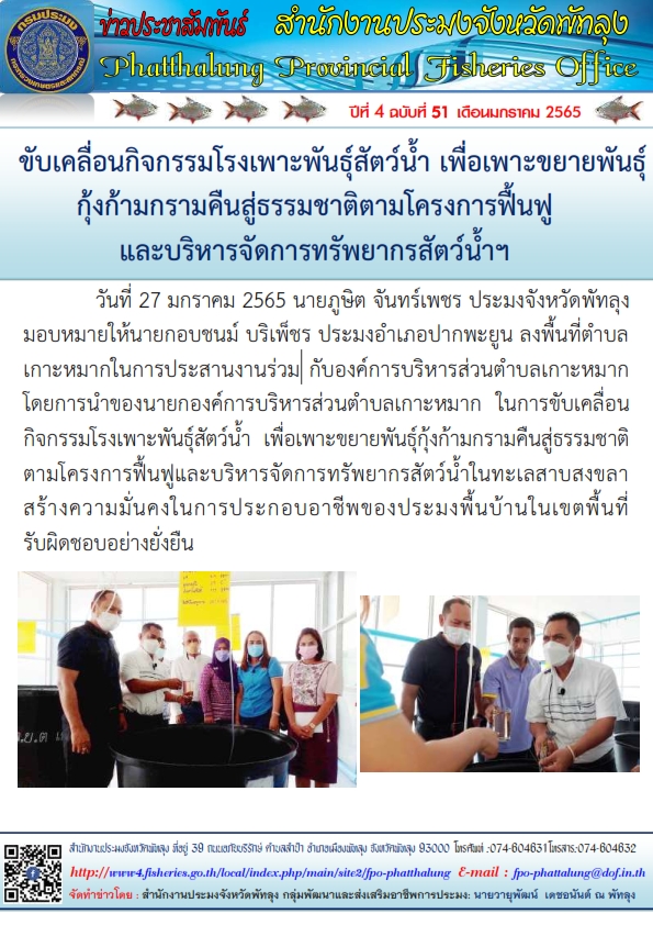วันที่ 27 มกราคม 2565 นายภูษิต จันทร์เพชร ประมงจังหวัดพัทลุง หมอบหมายให้นายกอบชนม์ บริเพ็ชร ประมงอำเภอปากพะยูน ลงพื้นที่ตำบลเกาะหมากในการประสานงานร่วม กับองค์การบริหารส่วนตำบลเกาะหมาก โดยการนำของนายกองค์การบริหารส่วนตำบลเกาะหมาก ในการขับเคลื่อนกิจกรรมโรงเพาะพันธุ์สัตว์น้ำ เพื่อเพาะขยายพันธุ์กุ้งก้ามกรามคืนสู่ธรรมชาติตามโครงการฟื้นฟูและบริหารจัดการทรัพยากรสัตว์น้ำในทะเลสาบสงขลา  สร้างความมั่นคงในการประกอบอาชีพของประมงพื้นบ้านในเขตพื้นที่รับผิดชอบอย่างยั่งยืน