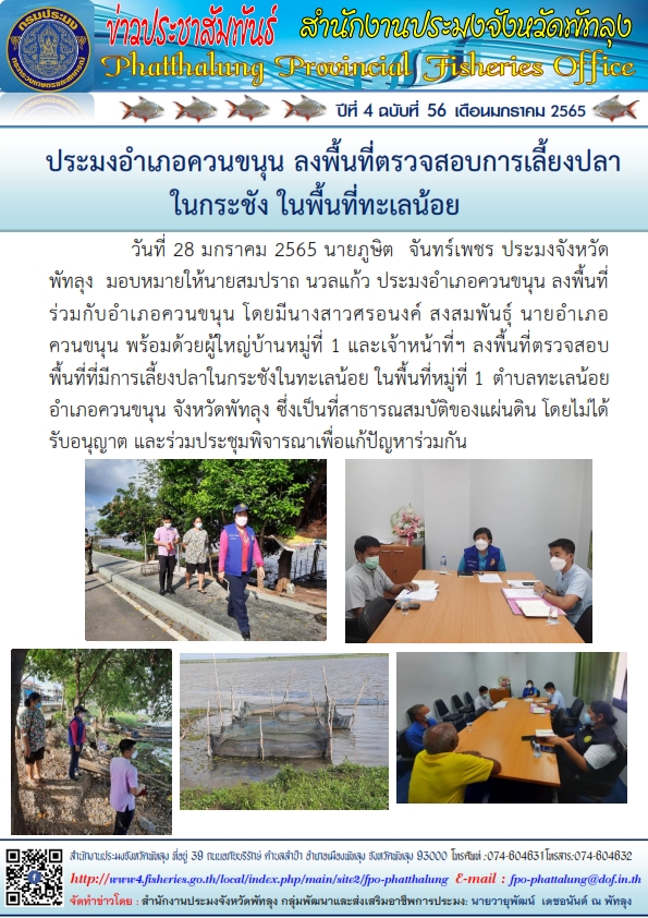 วันที่ 28 มกราคม 2565 นายภูษิต  จันทร์เพชร ประมงจังหวัดพัทลุง  มอบหมายให้นายสมปราถ นวลแก้ว ประมงอำเภอควนขนุน ลงพื้นที่ร่วมกับอำเภอควนขนุน โดยมีนางสาวศรอนงค์ สงสมพันธุ์ นายอำเภอควนขนุน พร้อมด้วยผู้ใหญ่บ้านหมู่ที่ 1 และเจ้าหน้าที่ฯ ลงพื้นที่ตรวจสอบพื้นที่ที่มีการเลี้ยงปลาในกระชังในทะเลน้อย ในพื้นที่หมู่ที่ 1 ตำบลทะเลน้อย อำเภอควนขนุน จังหวัดพัทลุง ซึ่งเป็นที่สาธารณสมบัติของแผ่นดิน โดยไม่ได้รับอนุญาต และร่วมประชุมพิจารณาเพื่อแก้ปัญหาร่วมกัน