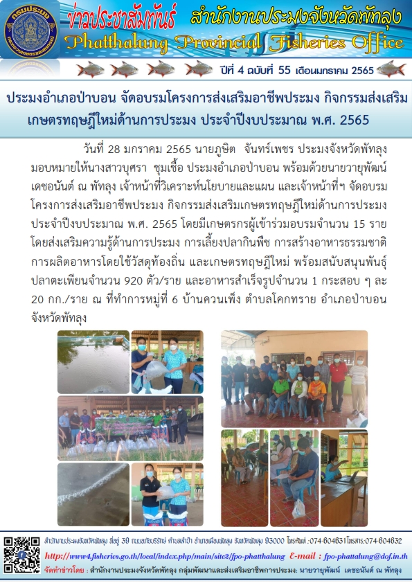 ประมงอำเภอป่าบอน จัดอบรมเกษตรกรที่เข้าร่วมโครงการส่งเสริมอาชีพการประมง กิจกรรมส่งเสริมเกษตรทฤษฎีใหม่ ประจำปีงบประมาณ พ.ศ.2565..คลิก