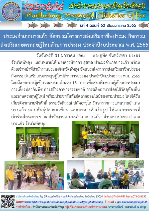 วันที่ 31 มกราคม 2565 นายภูษิต จันทร์เพชร ประมงจังหวัดพัทลุง มอบหมายให้ นางสาวทิพากร สุขพล ประมงอำเภอบางแก้ว พร้อมด้วยเจ้าหน้าที่สำนักงานประมงจังหวัดพัทลุง จัดอบรมโครงการส่งเสริมอาชีพประมง กิจกรรมส่งเสริมเกษตรทฤษฎีใหม่ด้านการประมง  ประจำปีงบประมาณ พ.ศ 2565 โดยมีเกษตรกรผู้เข้าร่วมอบรม จำนวน 15 ราย เพื่อส่งเสริมความรู้ด้านการประมง การเลี้ยงปลากินพืช การสร้างอาหารธรรมชาติ การผลิตอาหารโดยใช้วัสดุท้องถิ่น และเกษตรทฤษฎีใหม่ พร้อมประชาสัมพันธ์ตลาดออนไลน์ของกรมประมง   โดยได้รับเกียรติจากนายพิรศักดิ์ ธรรมธัชดิสรณ์ ปลัดอาวุโส รักษาราชการแทนนายอำเภอบางแก้ว  ร่วมมอบพันธุ์ปลาตะเพียน และอาหารสำเร็จรูปแก่เกษตรกร ณ สำนักงานเกษตรอำเภอบางแก้ว  ตำบลนาปะขอ อำเภอบางแก้ว จังหวัดพัทลุง