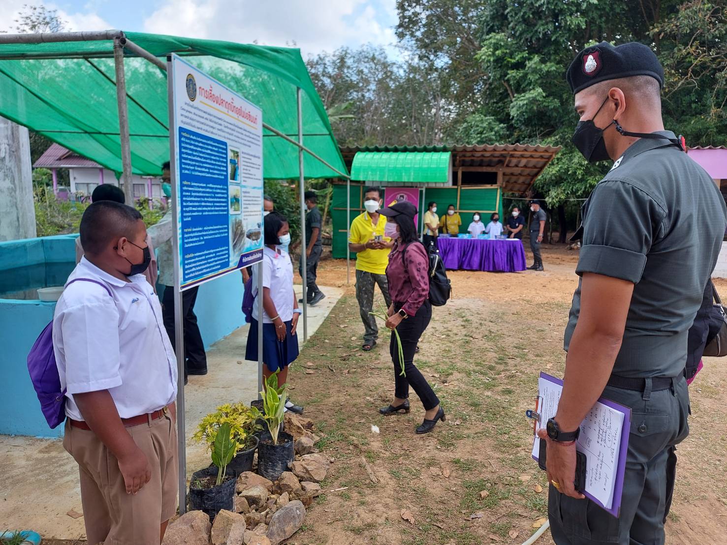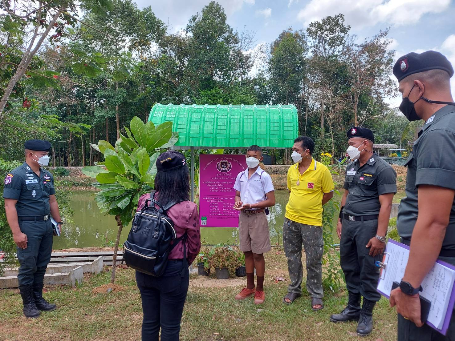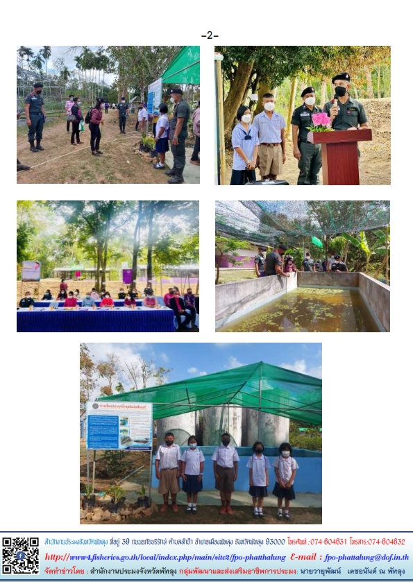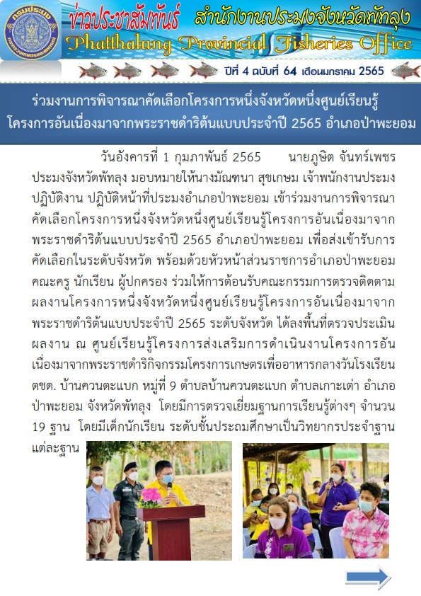 วันนี้ 1 ก.พ. 65  เวลา 9.30 น. นายภูษิต จันทร์เพชร ประมงจังหวัดพัทลุง มอบหมายให้นางมัณฑนา สุขเกษม เจ้าพนักงานประมงปฏิบัติงาน ปฏิบัติหน้าที่ประมงอำเภอป่าพะยอม เข้าร่วมงานการพิจารณาคัดเลือกโครงการหนึ่งจังหวัดหนึ่งศูนย์เรียนรู้โครงการอันเนื่องมาจากพระราชดำริต้นแบบประจำปี 2565 อำเภอป่าพะยอม เพื่อส่งเข้ารับการคัดเลือกในระดับจังหวัด พร้อมด้วยหัวหน้าส่วนราชการอำเภอป่าพะยอมคณะครู นักเรียน ผู้ปกครอง ร่วมให้การต้อนรับคณะกรรมการตรวจติดตามผลงานโครงการหนึ่งจังหวัดหนึ่งศูนย์เรียนรู้โครงการอันเนื่องมาจากพระราชดำริต้นแบบประจำปี 2565 ระดับจังหวัด ได้ลงพื้นที่ตรวจประเมินผลงานณศูนย์เรียนรู้โครงการส่งเสริมการดำเนินงานโครงการอันเนื่องมาจากพระราชดำริกิจกรรมโครงการเกษตรเพื่ออาหารกลางวันโรงเรียน ตชด. บ้านควนตะแบก หมู่ 9 ตำบลบ้านควนตะแบก ตำบลเกาะเต่า อำเภอป่าพะยอม จังหวัดพัทลุง โดยมีการตรวจเยี่ยมฐานการเรียนรู้ต่างๆ จำนวน 19 ฐาน  โดยมีเด็กนักเรียน ระดับชั้นประถมศึกษาเป็นวิทยากรประจำฐาน แต่ละฐาน