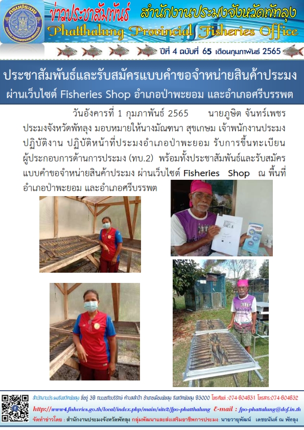 วันอังคารที่ 1 กุมภาพันธ์ 2565  นายภูษิต จันทร์เพชร ประมงจังหวัดพัทลุง มอบหมายให้นางมัณฑนา สุขเกษม เจ้าพนักงานประมงปฏิบัติงาน ปฏิบัติหน้าที่ประมงอำเภอป่าพะยอม รับการขึ้นทะเบียนผู้ประกอบการด้านการประมง (ทบ.2) พร้อมทั้งประชาสัมพันธ์และรับสมัครแบบคำขอจำหน่ายสินค้าประมง ผ่านเว็บไซร์ Fisheries Shop ณ พื่นที่อำเภอป่าพะยอมและอำเภอศรีบรรพต