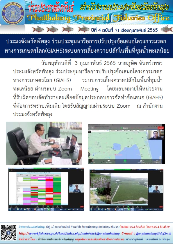 วันพฤหัสบดีที่  3 กุมภาพันธ์ 2565 นายภูษิต จันทร์เพชร  ประมงจังหวัดพัทลุง ร่วมประชุมหารือการปรับปรุงข้อเสนอโครงการมรดกทางการเกษตรโลก (GIAHS) ระบบการเลี้ยงควายปลักในพื้นที่ชุมน้ำ ทะเลน้อย ผ่านระบบ Zoom Meeting โดยมอบหมายให้หน่วยงาน ที่รับผิดชอบจัดทำรายละเอียดข้อมูลประกอบการจัดทำข้อเสนอ (GIAHS)ที่ต้องการทราบเพิ่มเติม โดยรับสัญญาณผ่านระบบ Zoom ณ สำนักงานประมงจังหวัดพัทลุง