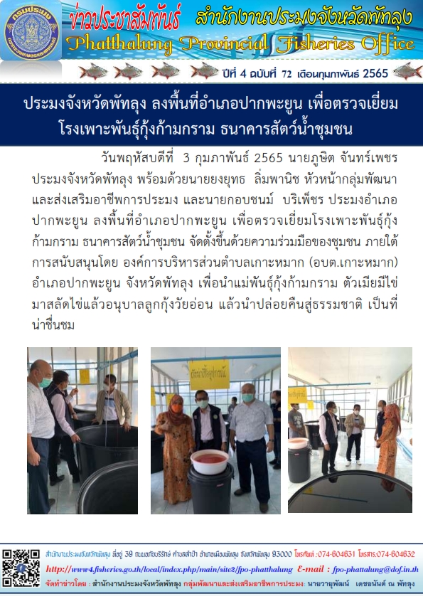 วันพฤหัสบดีที่  3 กุมภาพันธ์ 2565 นายภูษิต จันทร์เพชร  ประมงจังหวัดพัทลุง พร้อมด้วยนายยงยุทธ  ลิ่มพานิช หัวหน้ากลุ่มพัฒนาและส่งเสริมอาชีพการประมง และนายกอบชนม์  บริเพ็ชร ประมงอำเภอปากพะยูน ลงพื้นที่อำเภอปากพะยูน เพื่อตรวจเยี่ยมโรงเพาะพันธุ์กุ้งก้ามกราม ธนาคารสัตว์น้ำชุมชน จัดตั้งขึ้นด้วยความร่วมมือของชุมชน ภายใต้การสนับสนุนโดย องค์การบริหารส่วนตำบลเกาะหมาก (อบต.เกาะหมาก) อำเภอปากพะยูน จังหวัดพัทลุง เพื่อนำแม่พันธุ์กุ้งก้ามกราม ตัวเมียมีไข่มาสลัดไข่แล้วอนุบาลลูกกุ้งวัยอ่อน แล้วนำปล่อยคืนสู่ธรรมชาติ เป็นที่น่าชื่นชม