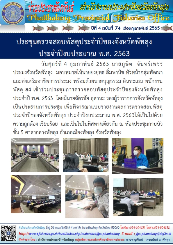 วันศุกร์ ที่ 4 กุมภาพันธ์ 2565 นายภูษิต จันทร์เพชร ประมงจังหวัดพัทลุง มอบหมายให้นายยงยุทธ ลิ่มพานิช หัวหน้ากลุ่มพัฒนาและส่งเสริมอาชีพการประมง พร้อมด้วย นายบุญธรรม อินทะเสม พนักงานพัสดุ ส4 เข้าร่วมประชุมการตรวจสอบพัสดุประจำปี พ.ศ.2563 โดยมีนายฉัตรชัย อุสาหะ รองผู้ว่าราชการจังหวัดพัทลุง เป็นประธานการประชุม เพื่อพิจารณาแบบรายงานผลการตรวจสอบพัสดุ ประจำปีของจังหวัดพัทลุง ประจำปีงบประมาณ พ.ศ. 2563 ให้เป็นไปด้วยความถูกต้อง เรียบร้อย และเป็นไปในทิศทางเดียวกัน ณ ห้องประชุมกาบบัว ชั้น 5 ศาลากลางพัทลุง อำเภอเมืองพัทลุง จังหวัดพัทลุง