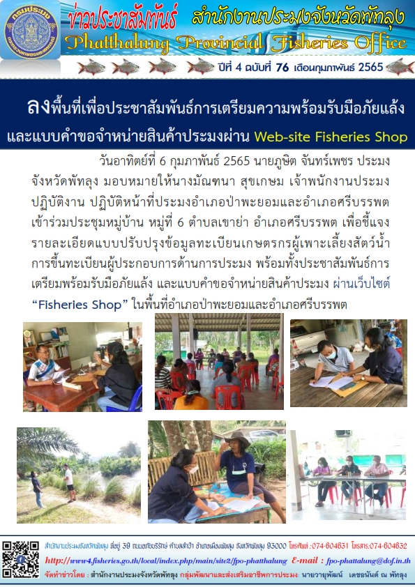 วันอาทิตย์ที่ 6 กุมภาพันธ์ 2565 นายภูษิต จันทร์เพชร ประมงจังหวัดพัทลุง มอบหมายให้นางมัณฑนา สุขเกษม เจ้าพนักงานประมงปฏิบัติงาน ปฏิบัติหน้าที่ประมงอำเภอป่าพะยอมและอำเภอศรีบรรพต เข้าร่วมประชุมหมู่บ้าน หมู่ที่ 6 ตำบลเขาย่า อำเภอศรีบรรพต เพื่อชี้แจงรายละเอียดแบบปรับปรุงข้อมูลทะเบียนเกษตรกรผู้เพาะเลี้ยงสัตว์น้ำ การขึ้นทะเบียนผู้ประกอบการด้านการประมง พร้อมทั้งประชาสัมพันธ์การเตรียมพร้อมรับมือภัยแล้ง และแบบคำขอจำหน่ายสินค้าประมง ผ่านเว็บไซต์ “Fisheries Shop” ในพื้นที่อำเภอป่าพะยอมและอำเภอศรีบรรพต